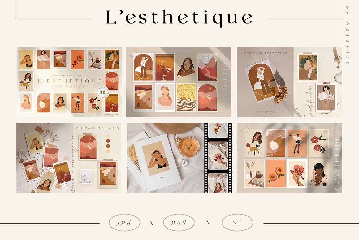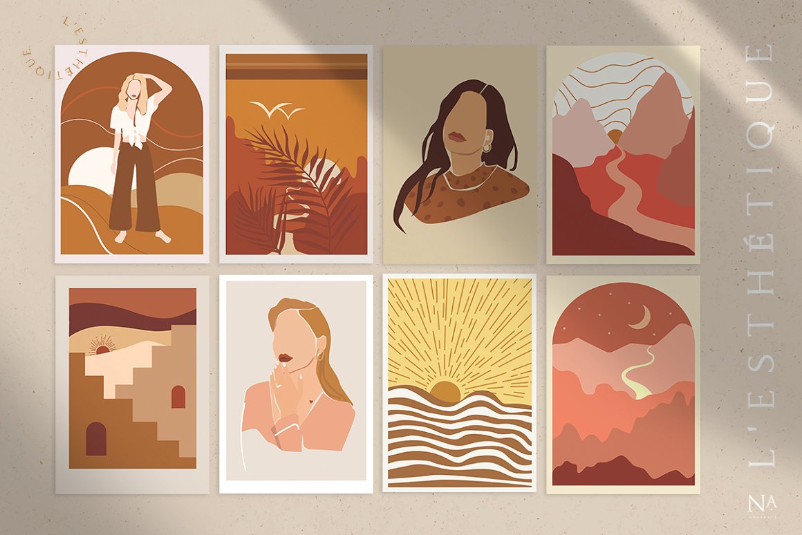 L’esthetique Modern Collection – Decorate your wall with this collection of modern&fashion postcards, use them for posts in Instagram and your projects. Use these elements to create your own unique Instagram account design or branding. You just need to select card and crop it, combine other provided items or add a quote on the empty space. And the personal card will be ready! In this pack, you can find a variety of fashionable arts and abstract modern illustrations. They are available to mix and match for design projects with endless composition combinations of all pieces. These elements are ideal for the creation of printed products: notebooks, invitations, personal postcards, branding identity and Instagram posts. Add these beautiful vector graphics to create your own interesting profile, branding style, send cards to your best friends, present for someone important or decorate your working place with the wall posters.