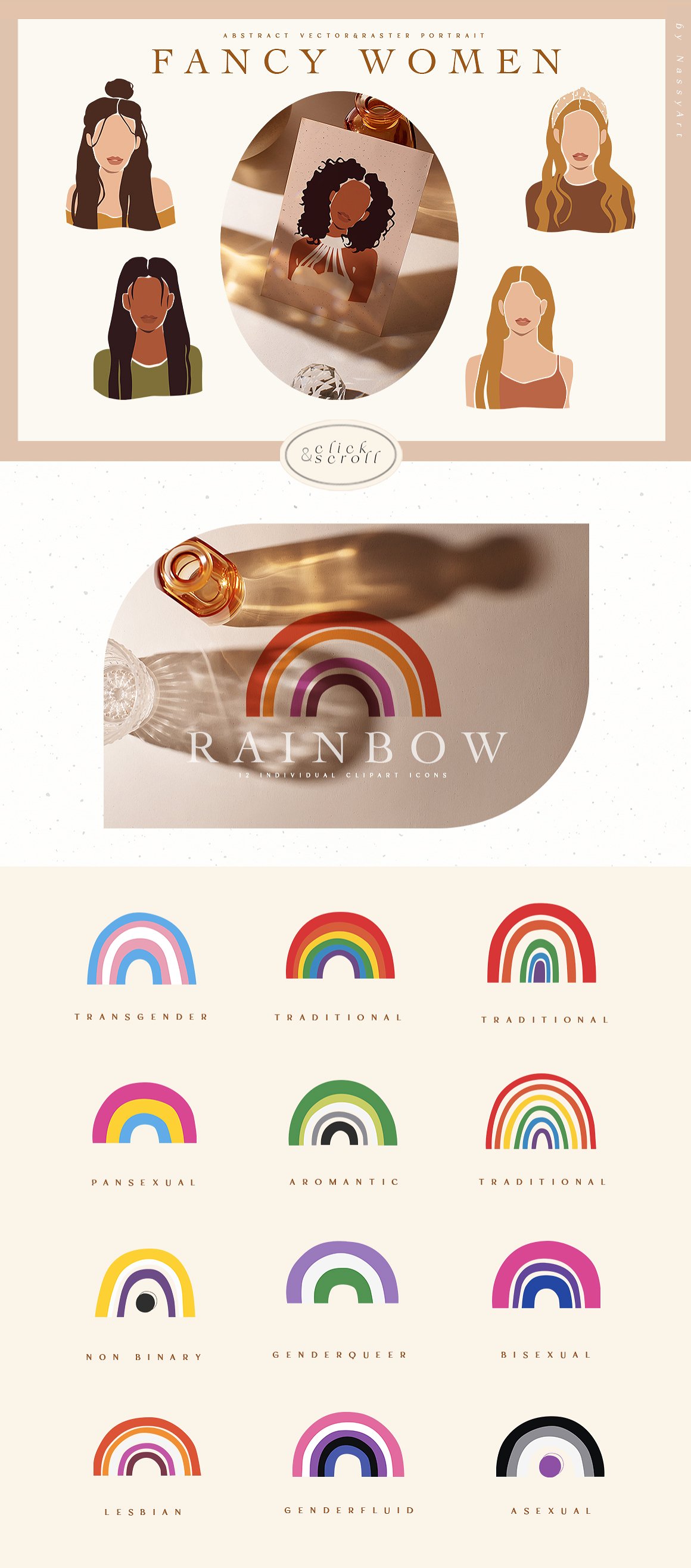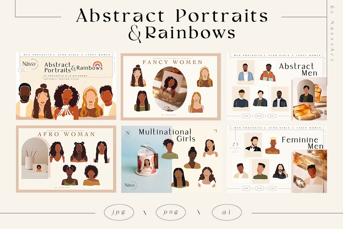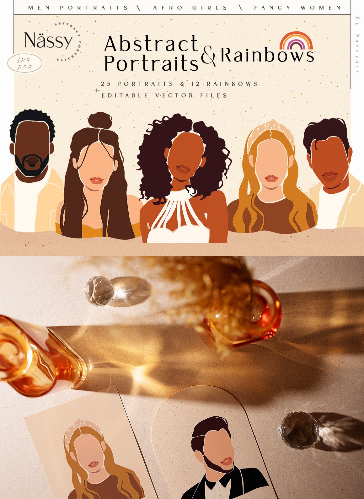 Abstract Women Men Portraits – Add these beautiful vector graphics to create your own interesting profile, branding style, earring cards, packaging or T-shirts design. Use these elements to create your own unique Instagram account design. You just need to select portrait and crop it, combine other provided rainbows or add a quote and the personal design will be ready! In this pack, you can find a variety of fashionable people portraits. They are available to mix and match for design projects with endless composition combinations of all portraits.