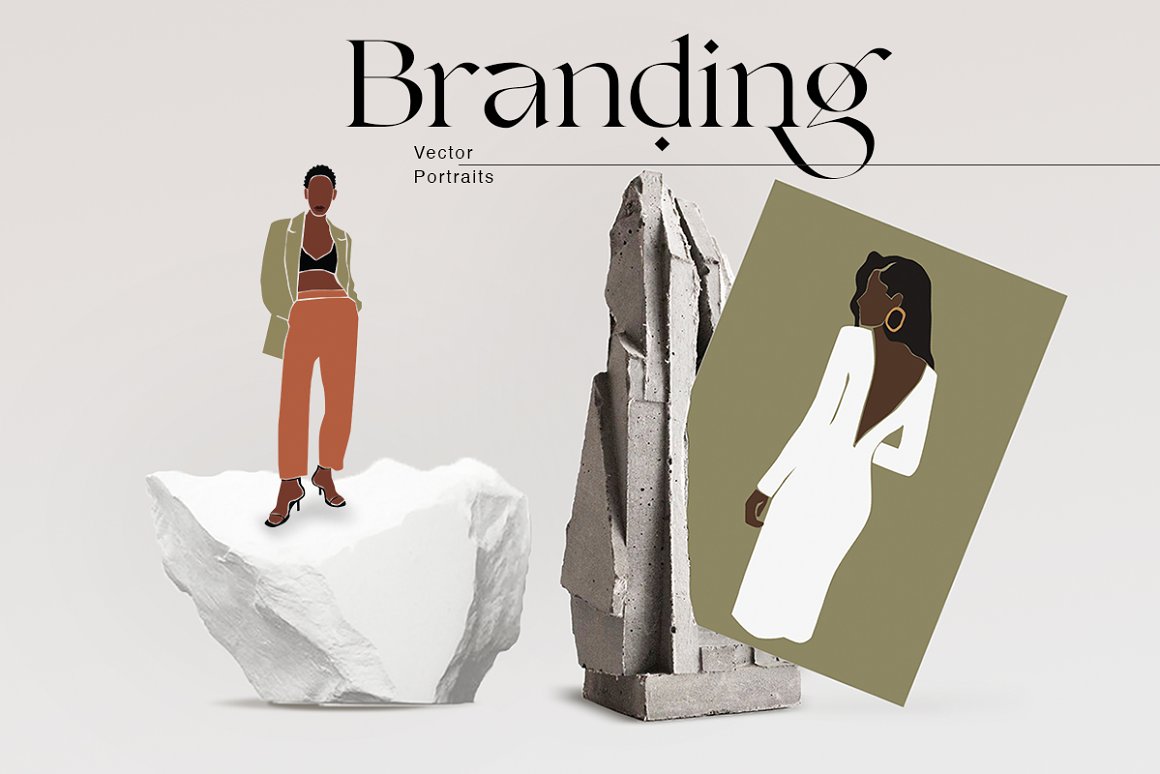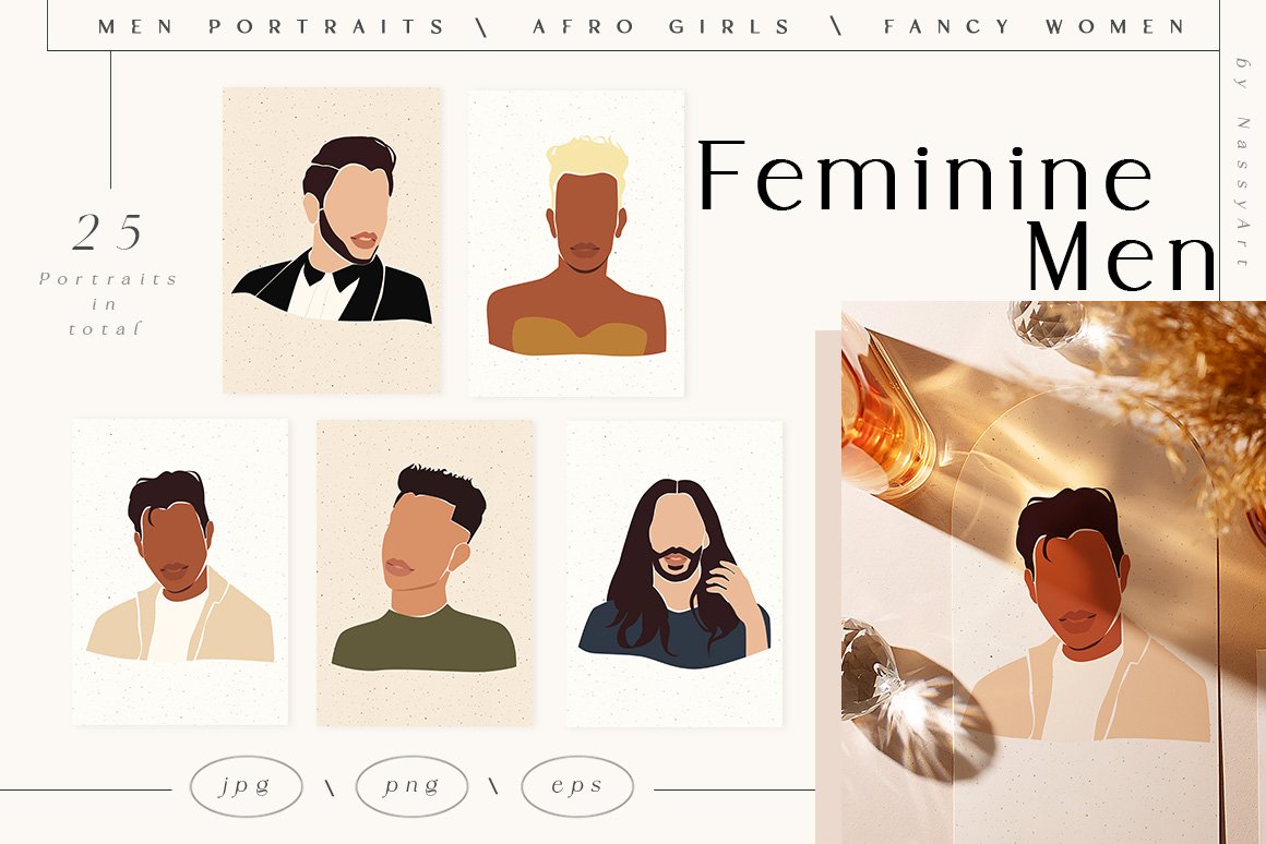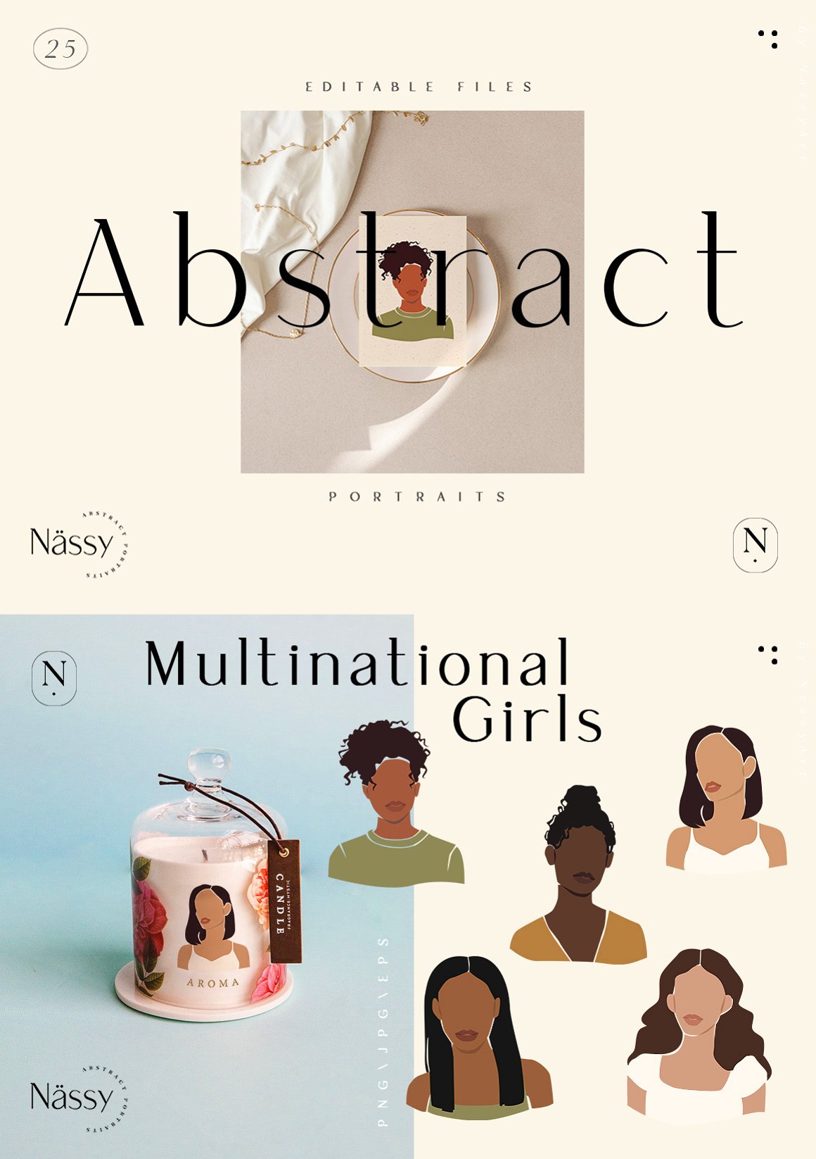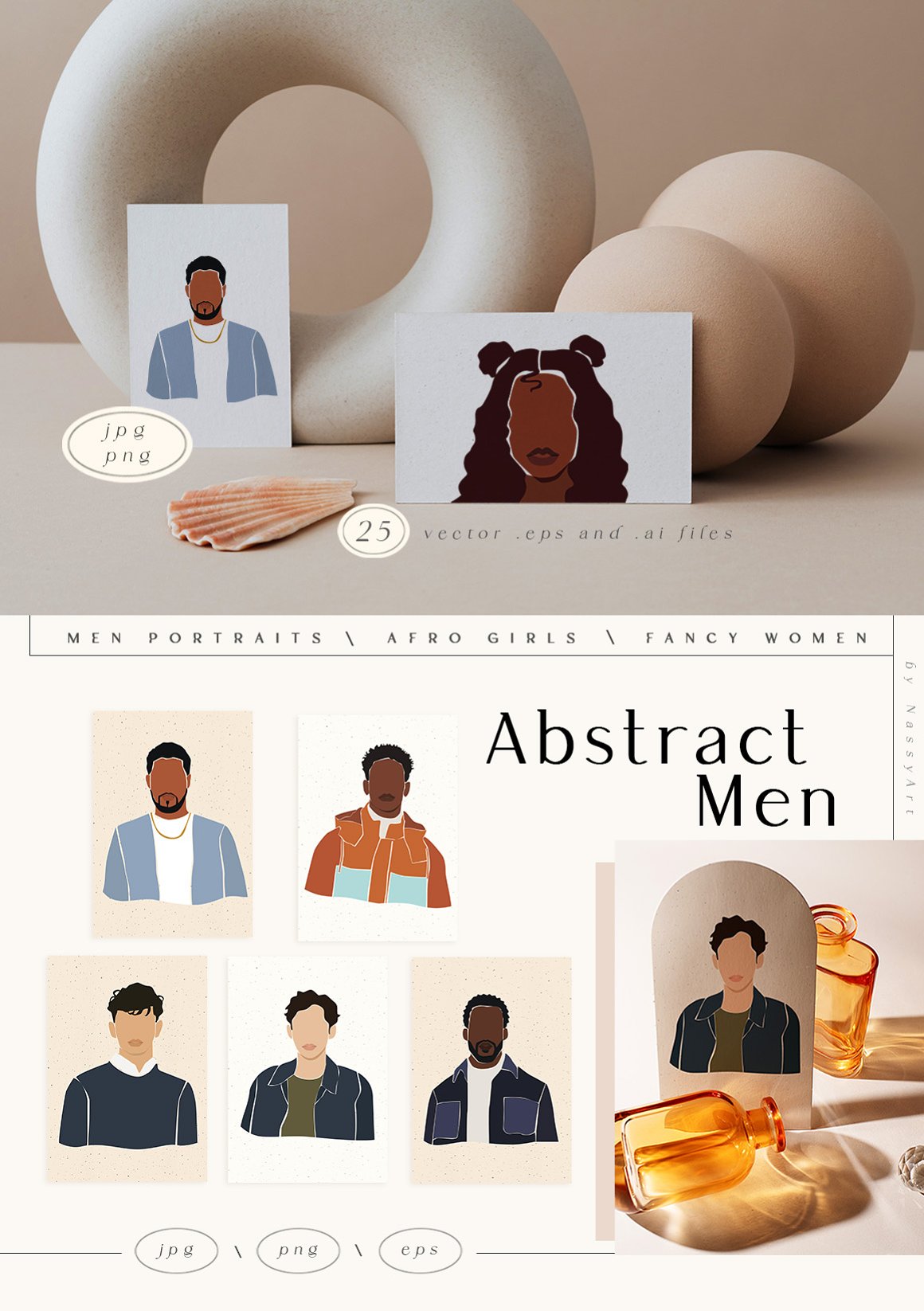 Abstract Women Men Portraits – Add these beautiful vector graphics to create your own interesting profile, branding style, earring cards, packaging or T-shirts design. Use these elements to create your own unique Instagram account design. You just need to select portrait and crop it, combine other provided rainbows or add a quote and the personal design will be ready! In this pack, you can find a variety of fashionable people portraits. They are available to mix and match for design projects with endless composition combinations of all portraits.