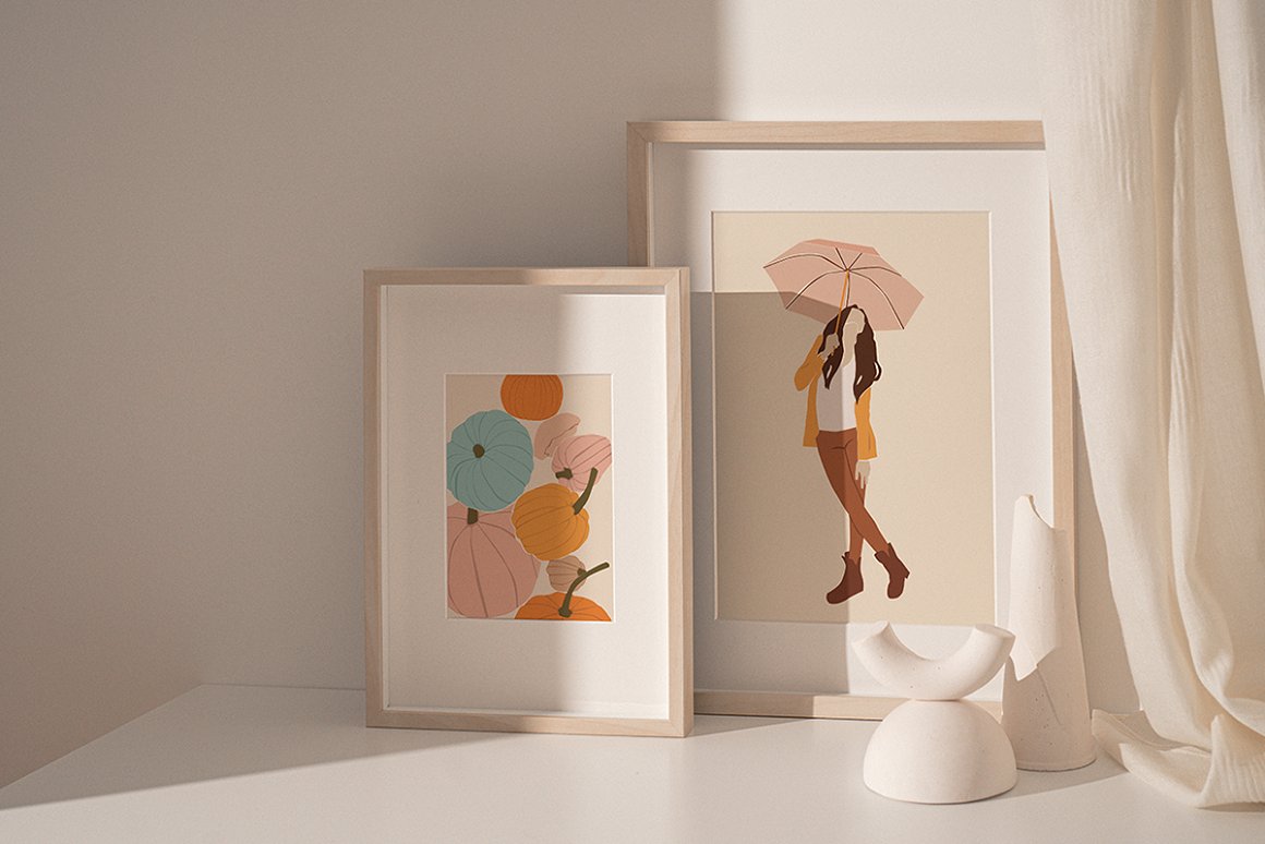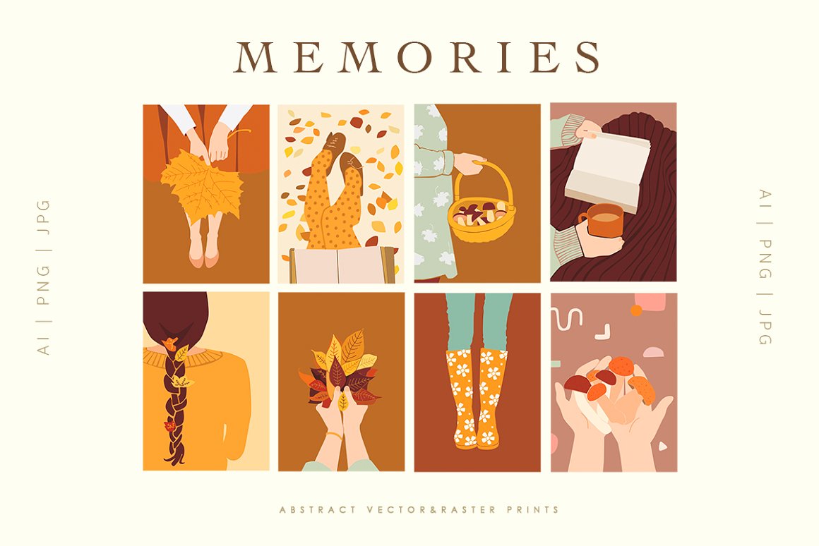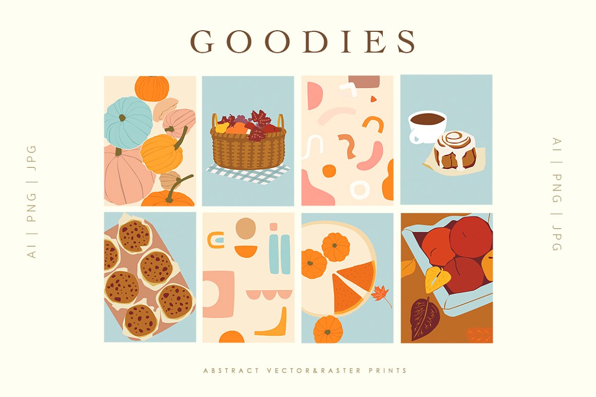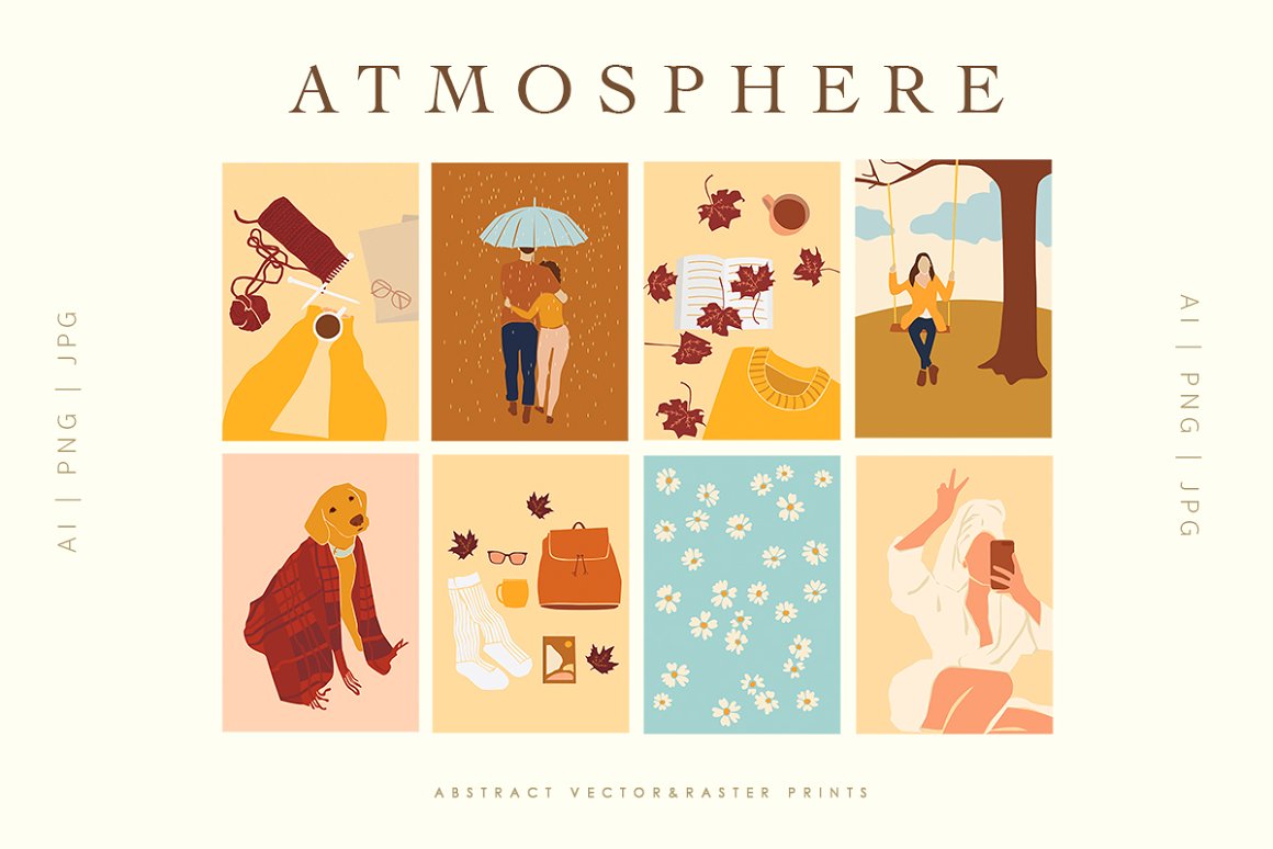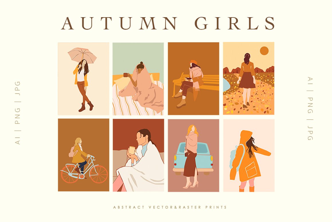 Abstract Autumn Fall Mood Posters – Decorate your wall with this collection of modern and fashion postcard illustration, use them for posts in Instagram, printable stationery business, design in Canva and your own projects. In this pack you will find a variety of cozy autumn arts as stylish girls portraits, yummy food, pumpkins, coffee, fall leaves and as bonus abstract modern backgrounds. These elements are ideal for the creation of printed products: notebooks, invitations, personal postcards, branding identity and Instagram posts.
