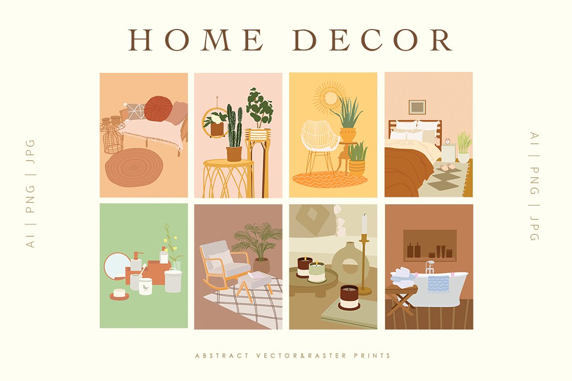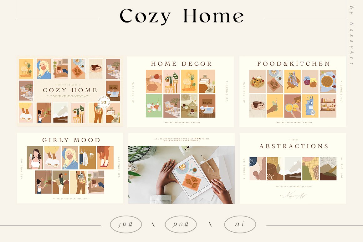 - 32 Abstract Cozy Home Illustrations (PNG and JPG: 1749x2481px, 300 dpi – A5 format)