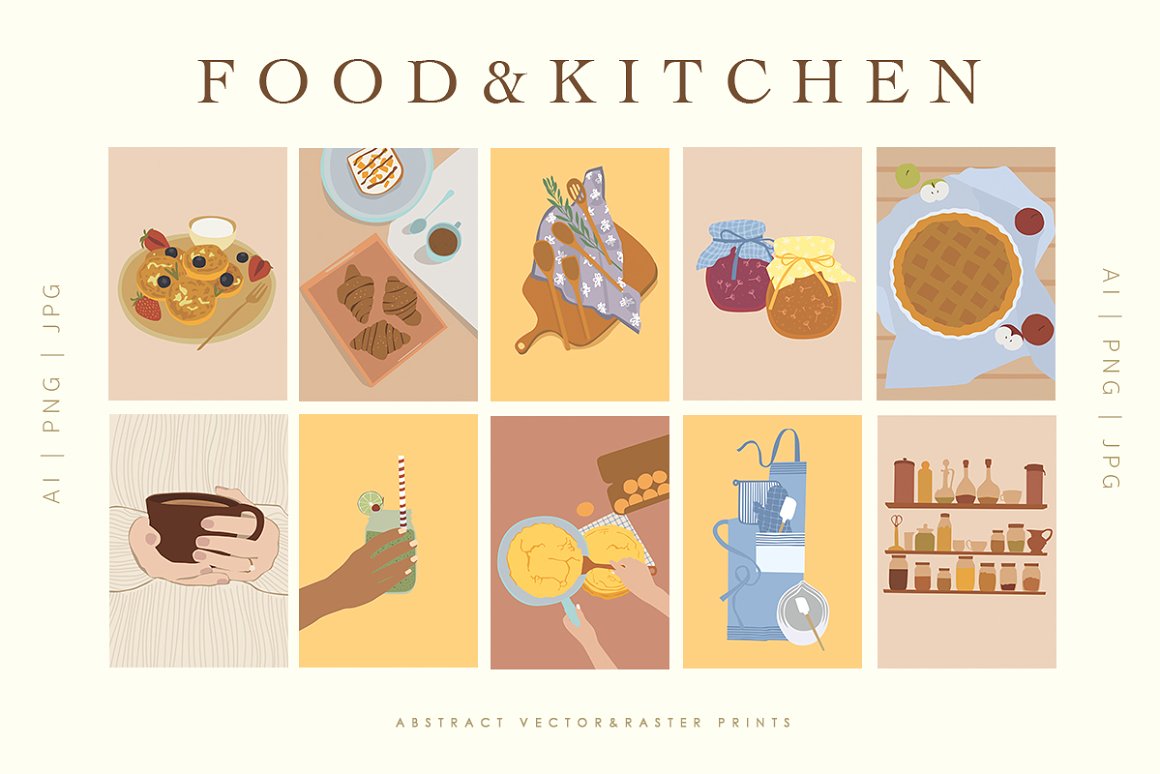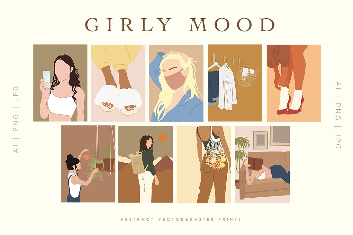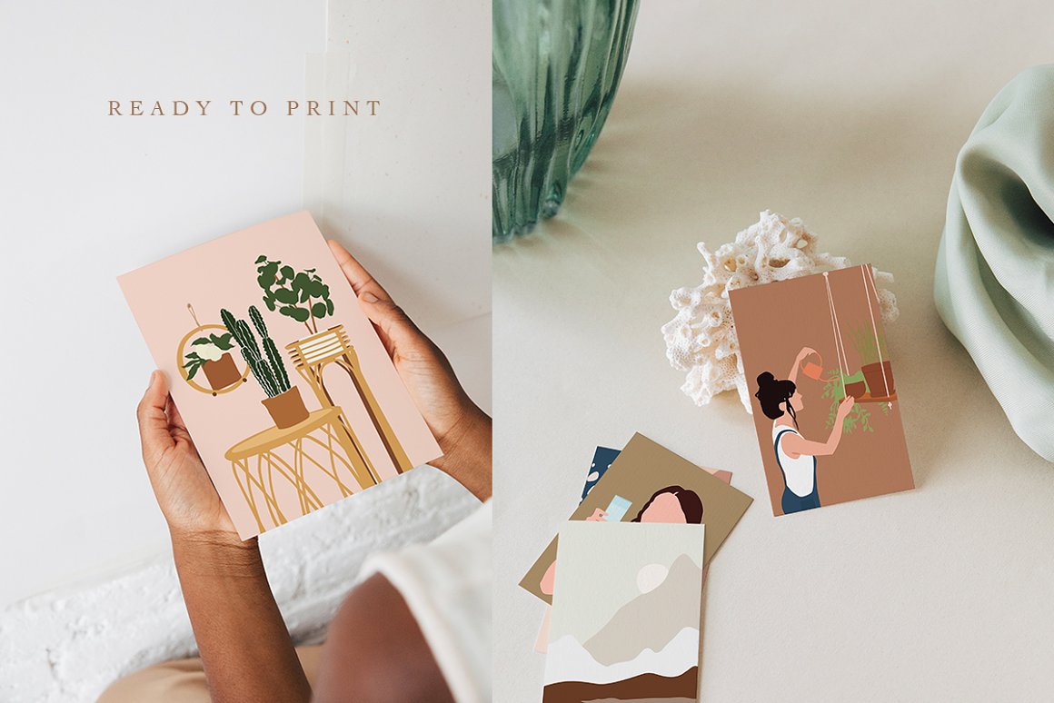 Abstract Cozy Home Illustrations – Decorate your wall with this collection of modern and fashion postcard illustration, use them for posts in Instagram, printable stationery business, design in Canva and your own projects. In this pack you will find a variety of cozy hygge arts with relaxing girls illustration, kitchen preparations with food, home decor and interior and as bonus abstract modern backgrounds. These elements are ideal for the creation of printed products: notebooks, invitations, personal postcards, branding identity and Instagram posts.