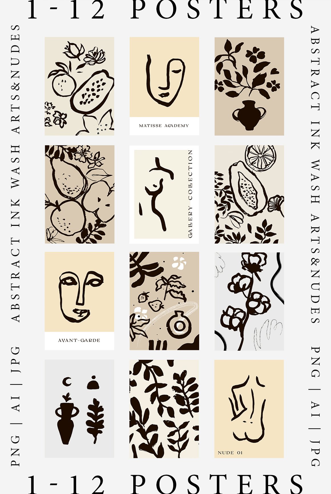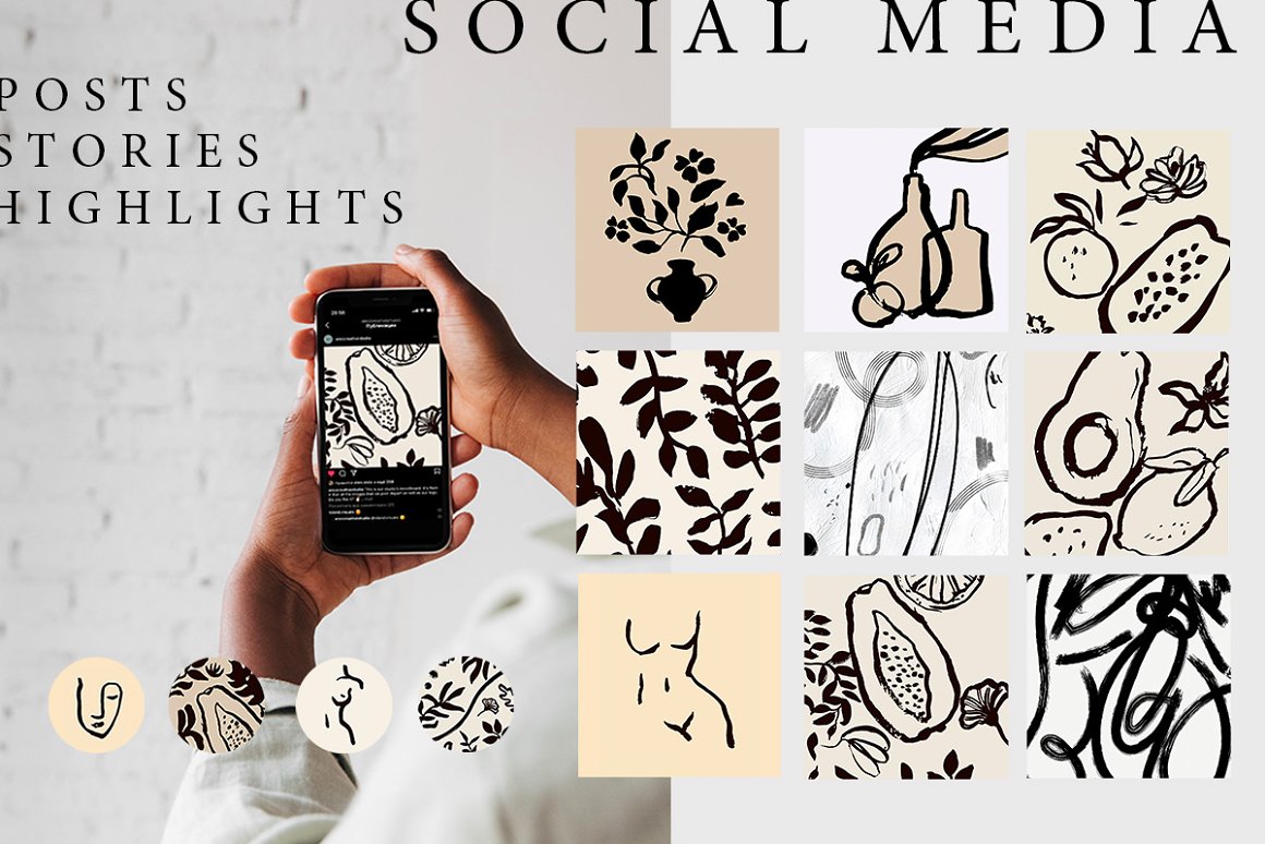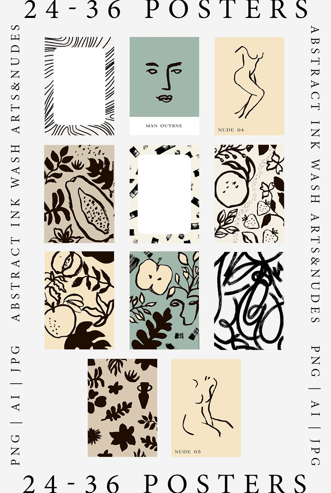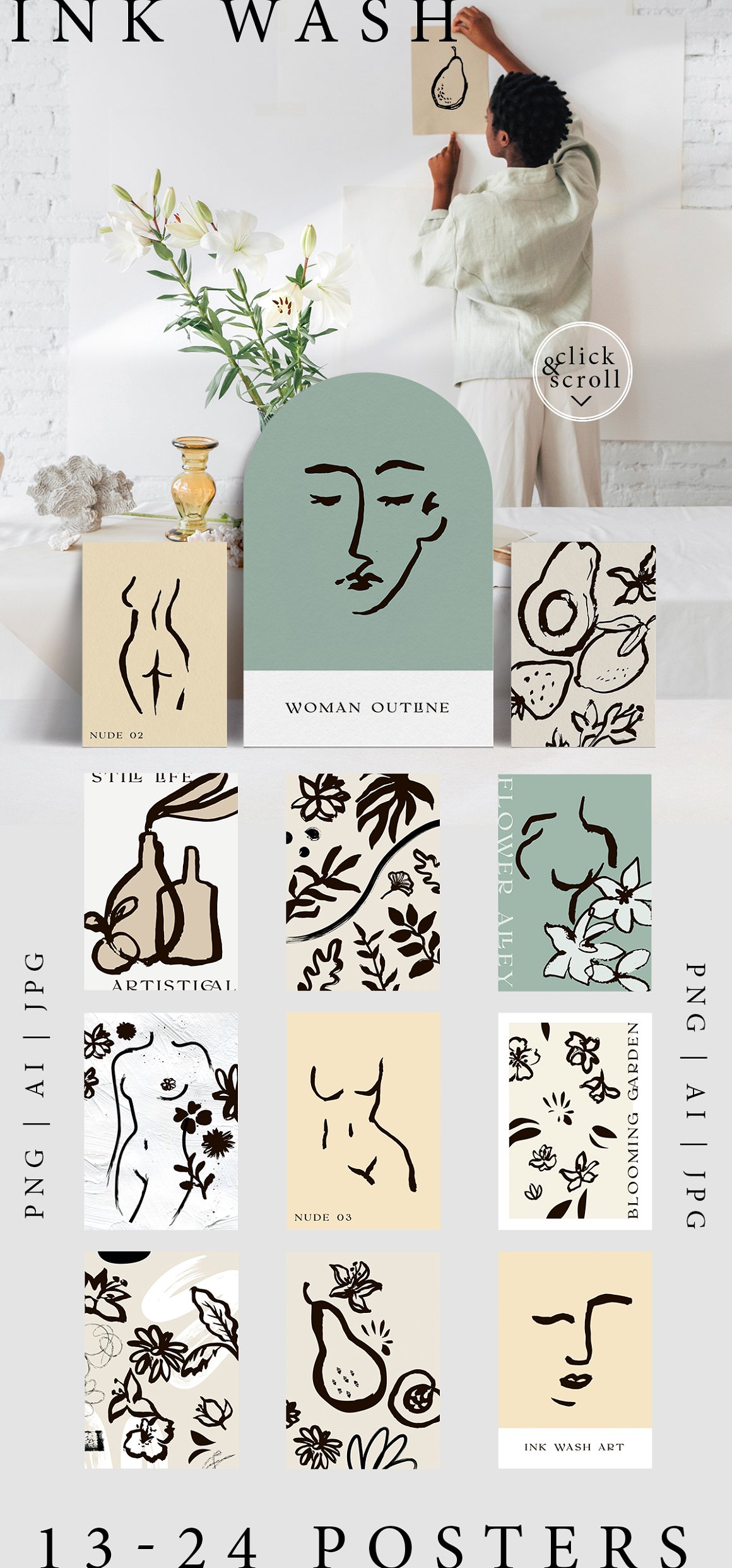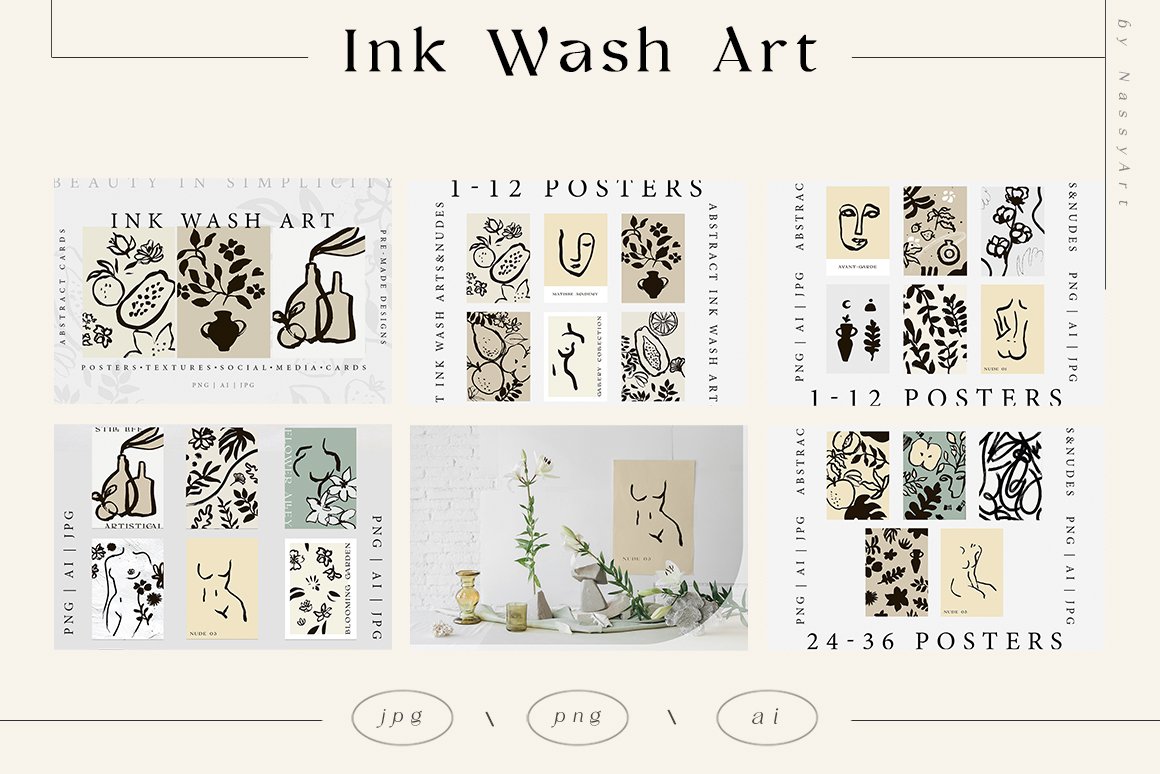 Abstract Ink Wash Floral Posters – happy to present you hand-painted abstract floral, woman nude and face ink arts carefully scanned and converted to vector. You will find in this set 40 Posters, Instagram Posts, Stories and pre-made highlights, abstract acrylic textures, cards for invitation letter and vector ink shapes.