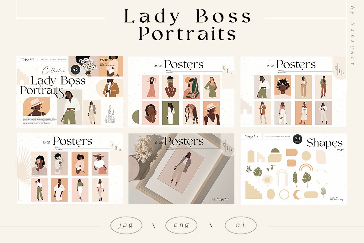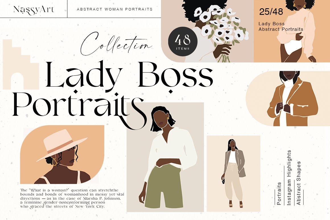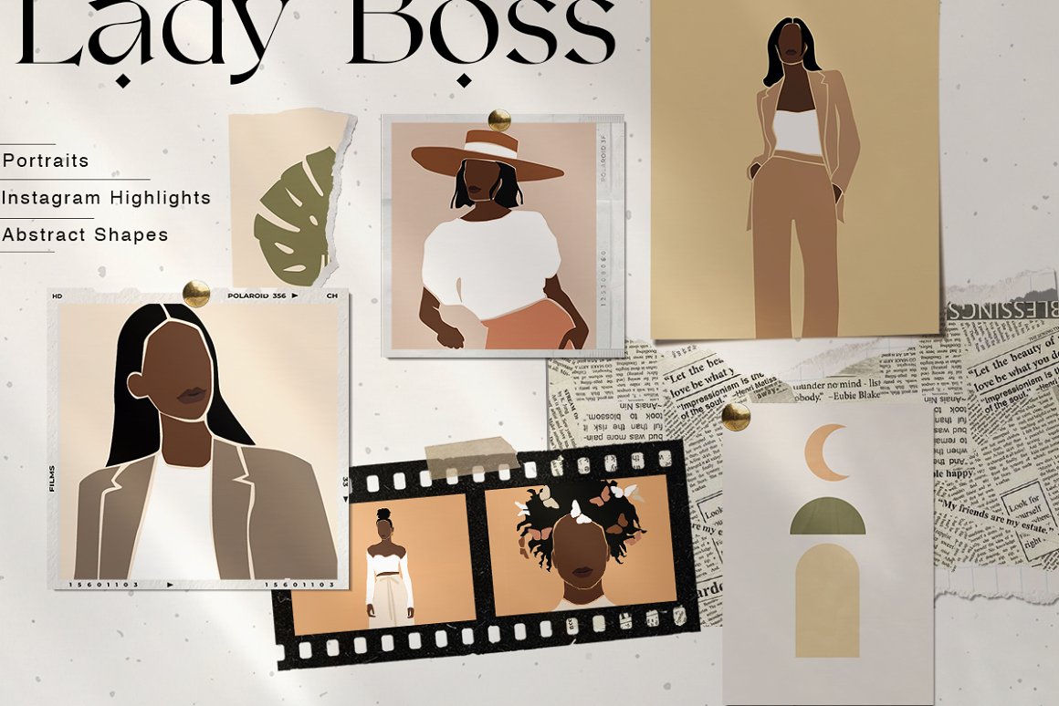 Lady Boss Woman Abstract Portraits – Decorate your wall with this collection of modern and fashion postcards, use them for posts in Instagram and your projects. Use these elements to create your own unique Instagram account design or branding. You just need to select card and crop it, combine other provided items or add a quote on the empty space. And the personal card will be ready! In this pack, you can find a variety of fashionable arts and abstract modern illustrations. They are available to mix and match for design projects with endless composition combinations of all pieces. These elements are ideal for the creation of printed products: notebooks, invitations, personal postcards, branding identity and Instagram posts.