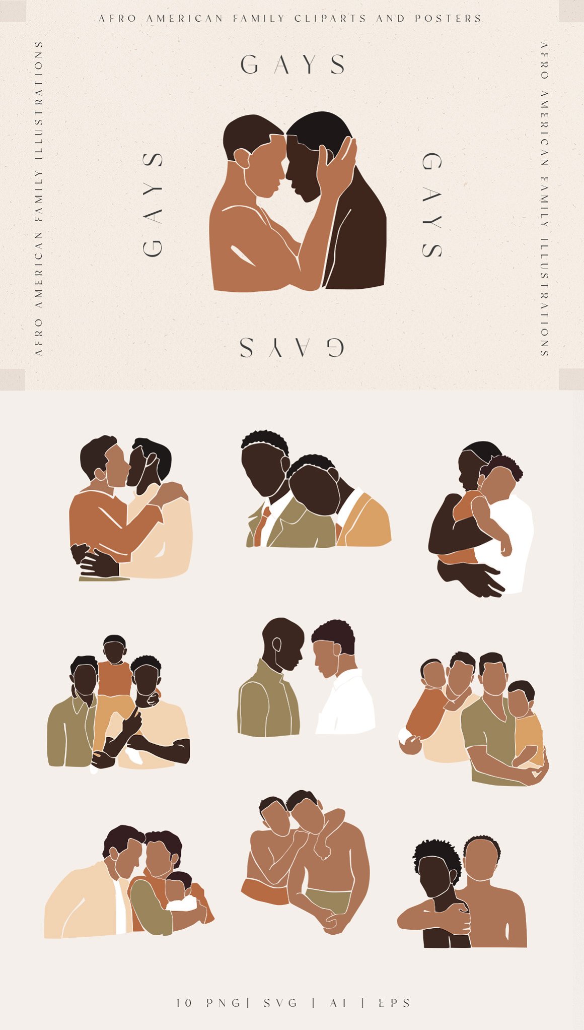 Abstract Family&Kids LGBT Pride – it’s a big collection of 41 pre-made abstract posters with Traditional Family, Babies, Lesbians and Gays. You can mix elements, change sizes or use png with isolated background for your creative ideas, projects, social media and invitations. Create your business with trendy vector illustrations, add unique touch to your ideas.