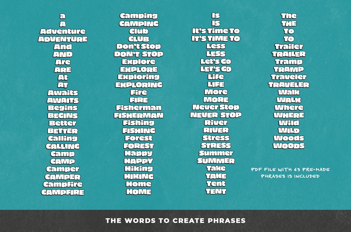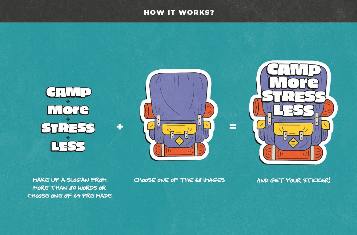 But that’s not all. There are also 90 graphic words to create your own slogan or phrase for your graphic. All the objects have been created with space for text in mind. So you’ll be able to set the words on graphic as you want to. For ease of use, we also prepared more than 60 ready-made phrases. Don’t miss this unique & retro style sticker or t-shirt design creator 😉