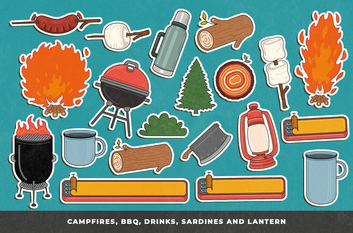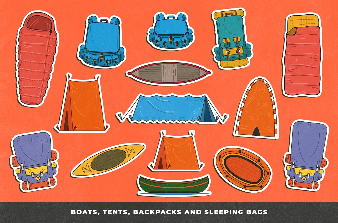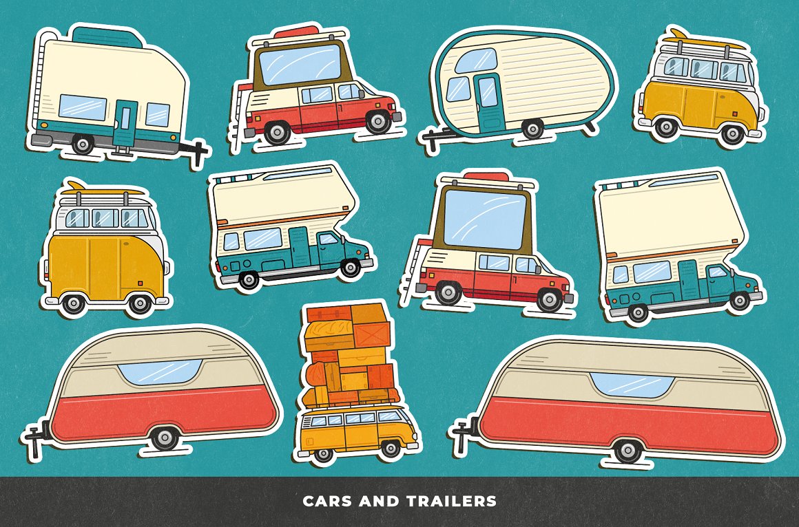 Introducing you the Adventure Awaits Outdoor sticker creator from Vintage Voyage. If you miss the summer adventures like hiking, fishing, traveling by trailer or just a campfire’s smell – this pack is absolutely for you. 68 trendy illustrated objects like vans or trailers, tents, boots, backpacks, sleeping bags, campfires, hats, fishing stuff, maps or BBQ grills – the whole collection is imbued with the adventure spirit.