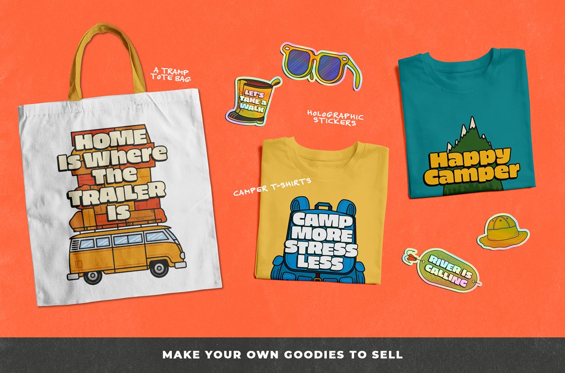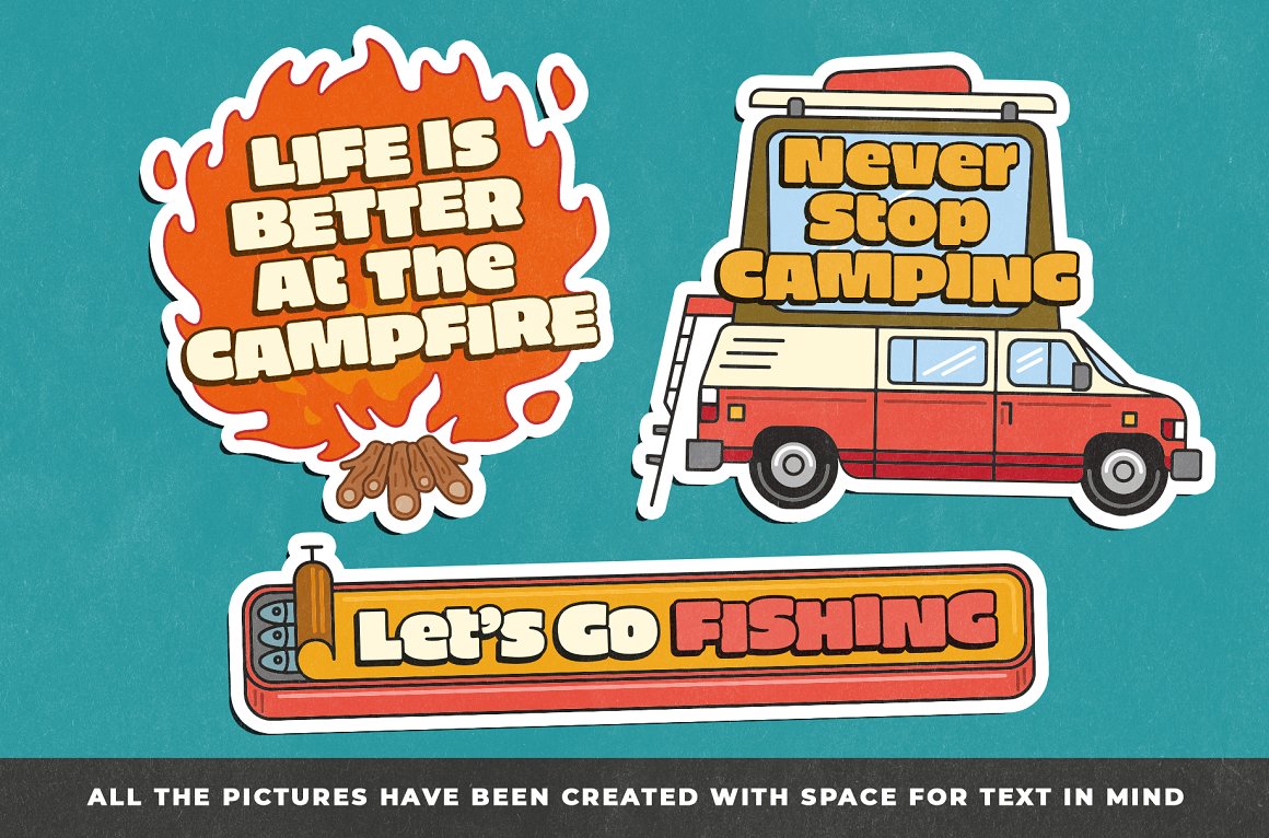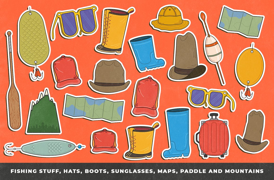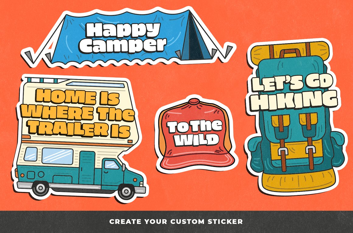 Introducing you the Adventure Awaits Outdoor sticker creator from Vintage Voyage. If you miss the summer adventures like hiking, fishing, traveling by trailer or just a campfire’s smell – this pack is absolutely for you. 68 trendy illustrated objects like vans or trailers, tents, boots, backpacks, sleeping bags, campfires, hats, fishing stuff, maps or BBQ grills – the whole collection is imbued with the adventure spirit.