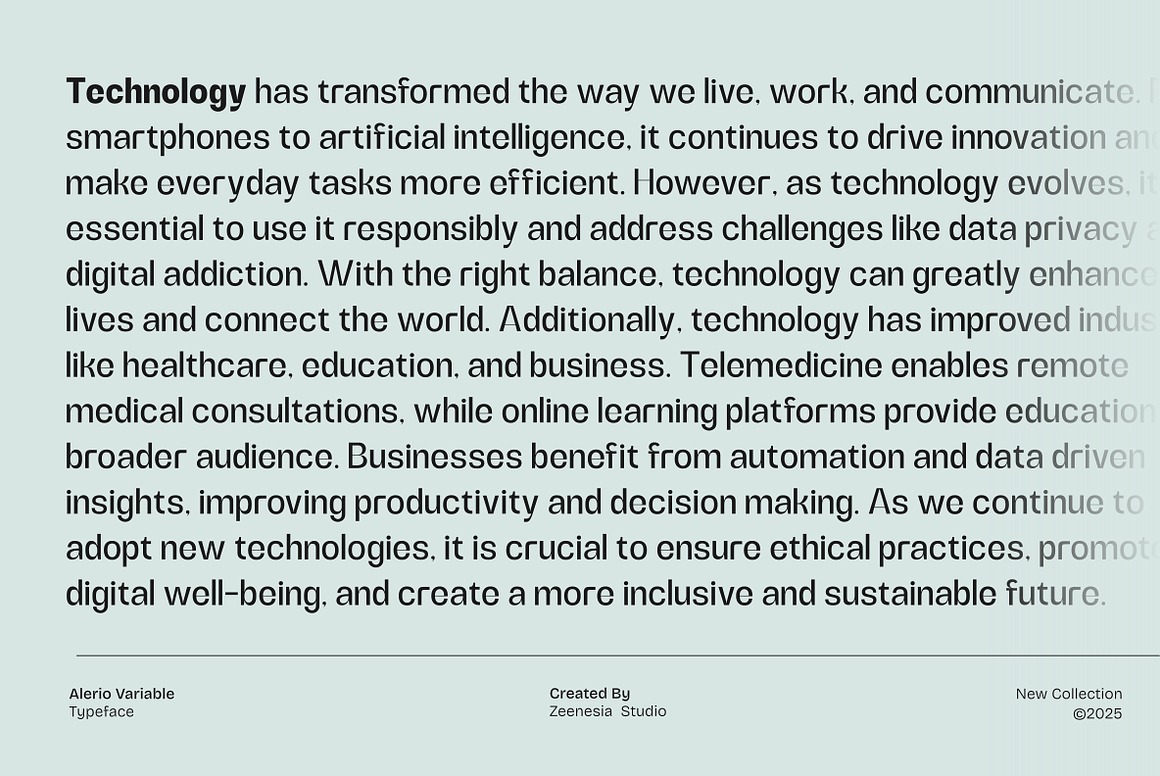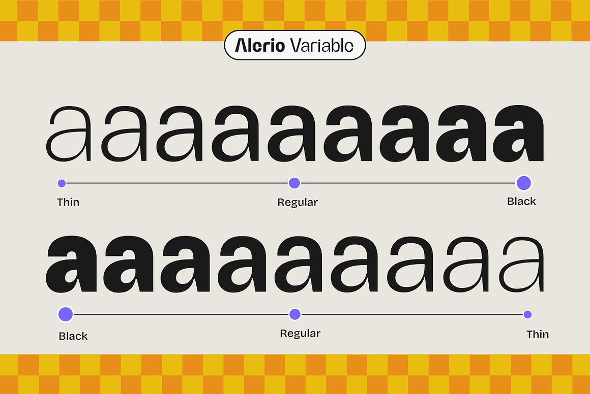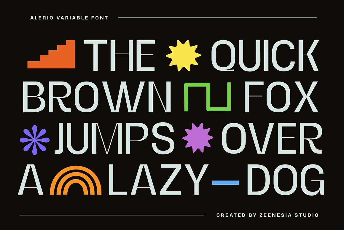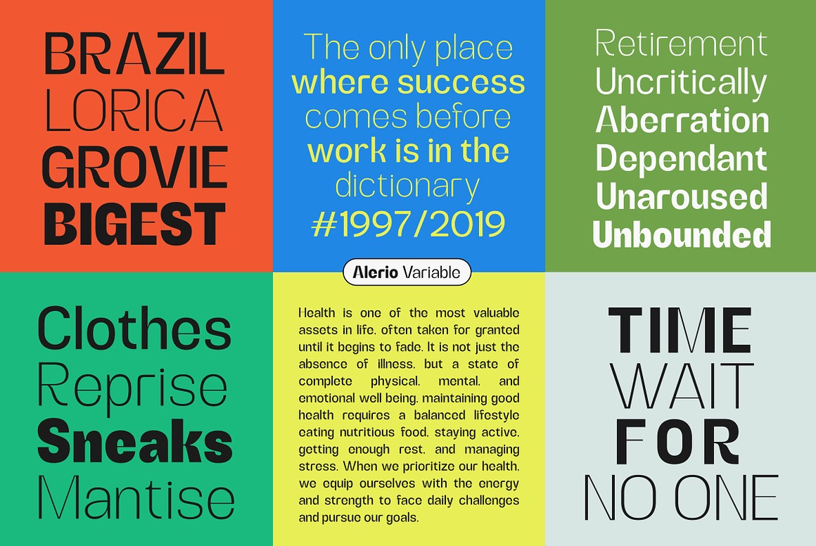 Say hello to Alerio – A modern sans serif that’s bold, flexible, and full of fun! Alerio is a bold and versatile sans serif typeface designed to bring clarity, strength, and modern charm to any design. With a full range of weights from Thin to Black, Alerio adapts seamlessly to different creative needs—whether for branding, editorial design, digital interfaces, or striking display headlines. With its clean shapes and smooth curves, Alerio feels fresh and easy to read, but also brings a cheerful personality to your design. The variable font format allows for smooth flexibility, giving designers complete control over weight and expression in typography. Alerio is here to make your work shine brighter!