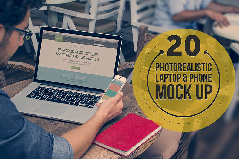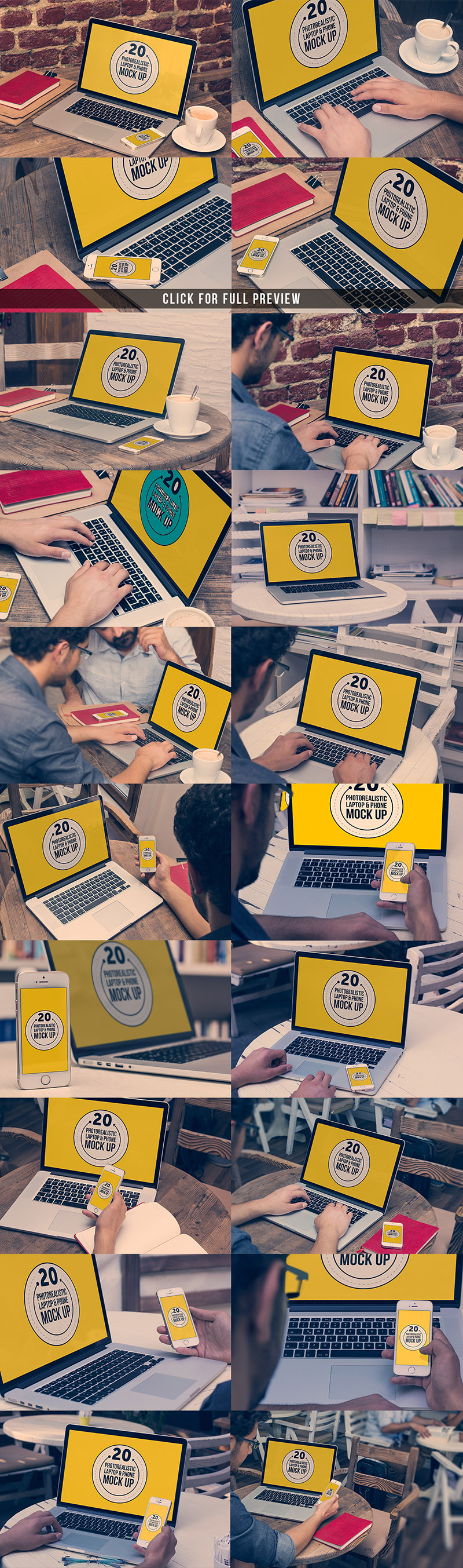 20 Macbook and iPhone mock ups. Based on real photos that taken in a coffee shop. You can show your works both Macbook and iPhone. You can show your design responsive. Also all PSD mock up files have ready made light setups. Fully layered reflections and shadows.