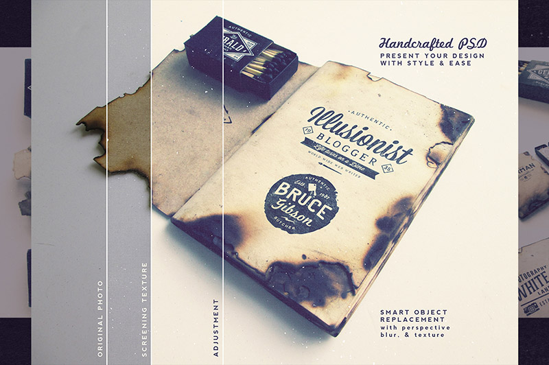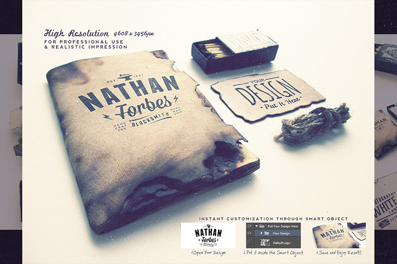 Present your design with these weathered mock-ups and impress your clients in no time. This set of mock-ups were handmade by me through distressing gears with fire and ink and stinky coffee – hope you guys enjoy and create something inspiring with them.