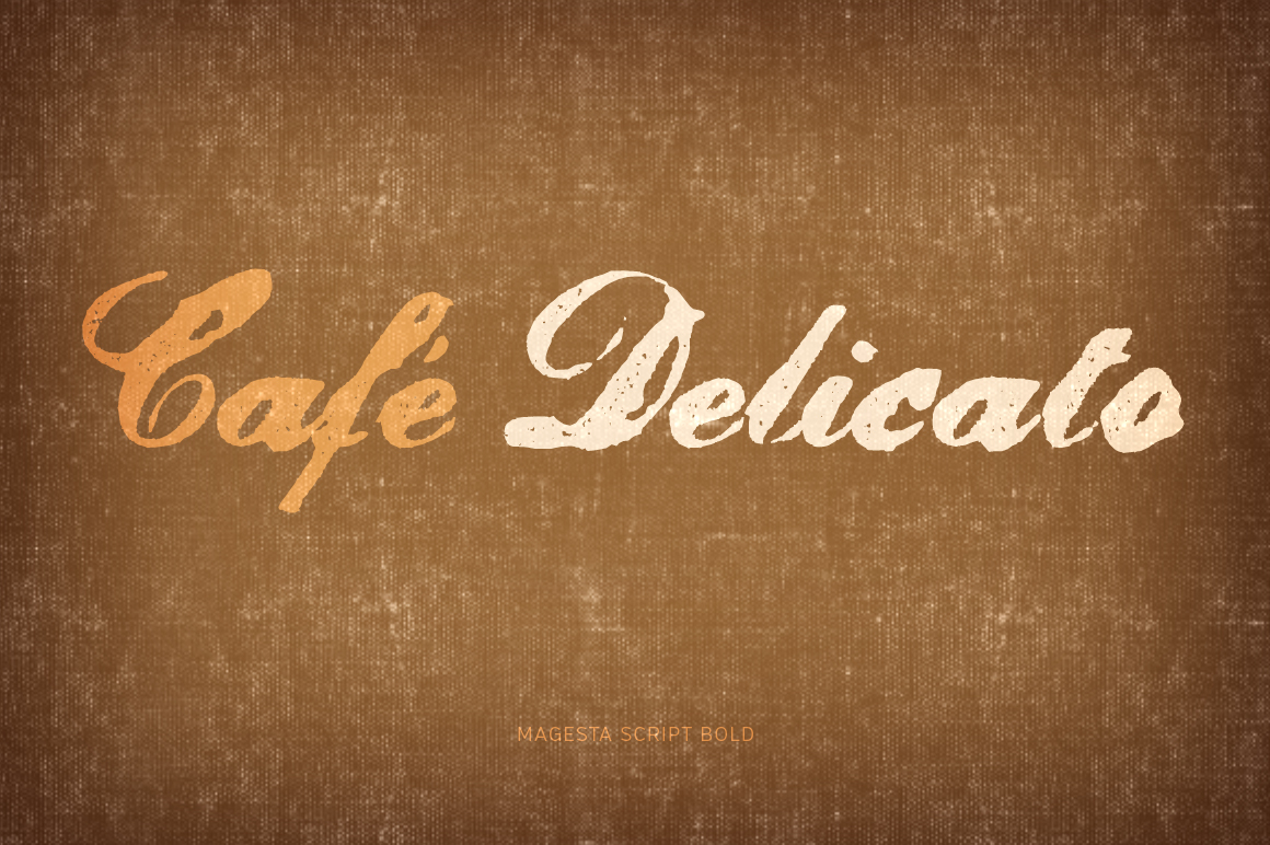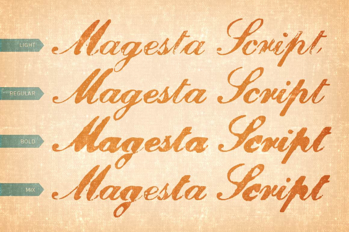 The Magesta Script family by Yellow Design Studio is a set of four retro script fonts that capture the warm, authentic qualities of letterpress printing. Light, Regular, and Bold weights simulate different levels of ink coverage, while Mix is a combination of all three. Texture and slight misalignment add to its realism and vintage charm.