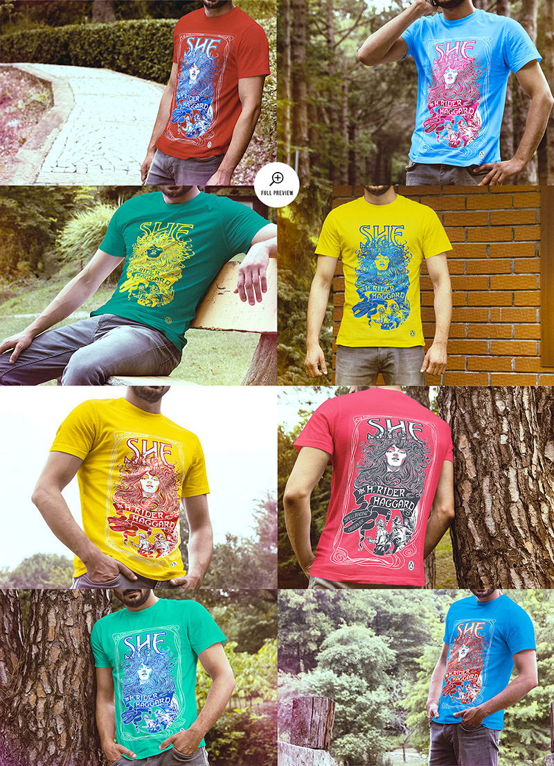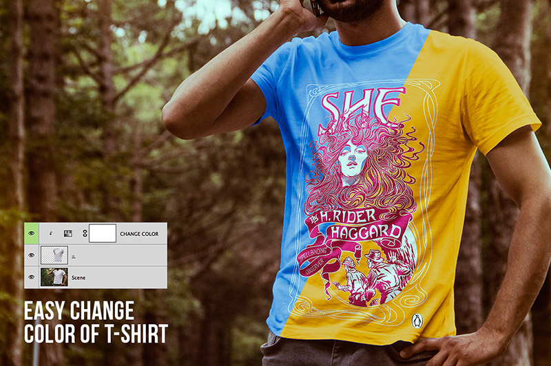 9 T-Shirt Mock Up PSD Files. Photos taken in nature and forest style. You can apply your own design and change t-shirt color in seconds. Also all PSD files includes light setup, well organized layers and separated shadows and light layers. Also you can use for print so these files in 3500px @ 300 dpi.