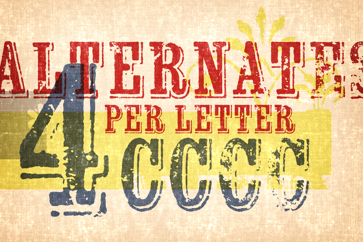 Wausau is a grungy, shadowed serif from Yellow Design Studio with a vintage letterpress feel. It’s worn and weathered and full of texture and charm. Each letter has 4 different distress options which can be mixed and matched for variety and realism. Features include double-letter ligatures to eliminate duplicate distressing in adjacent characters, a complete set of ornamental caps, and an extra set of vintage ornaments and flourishes. Wausau is an all-caps font with different distress options for upper and lowercase. To access the additional, extra-distressed letters use “Smallcaps”. To access the vintage ornaments, use the opentype feature “Swash”.