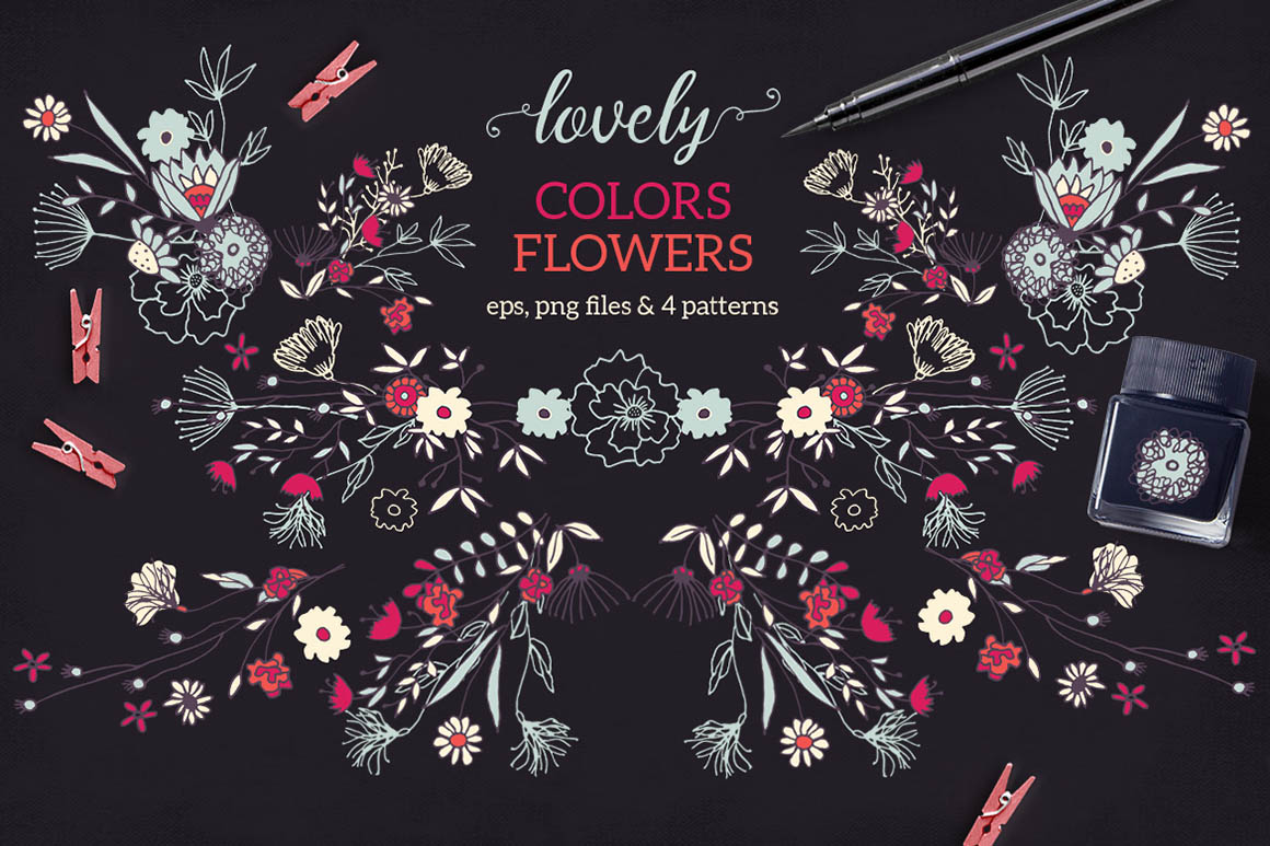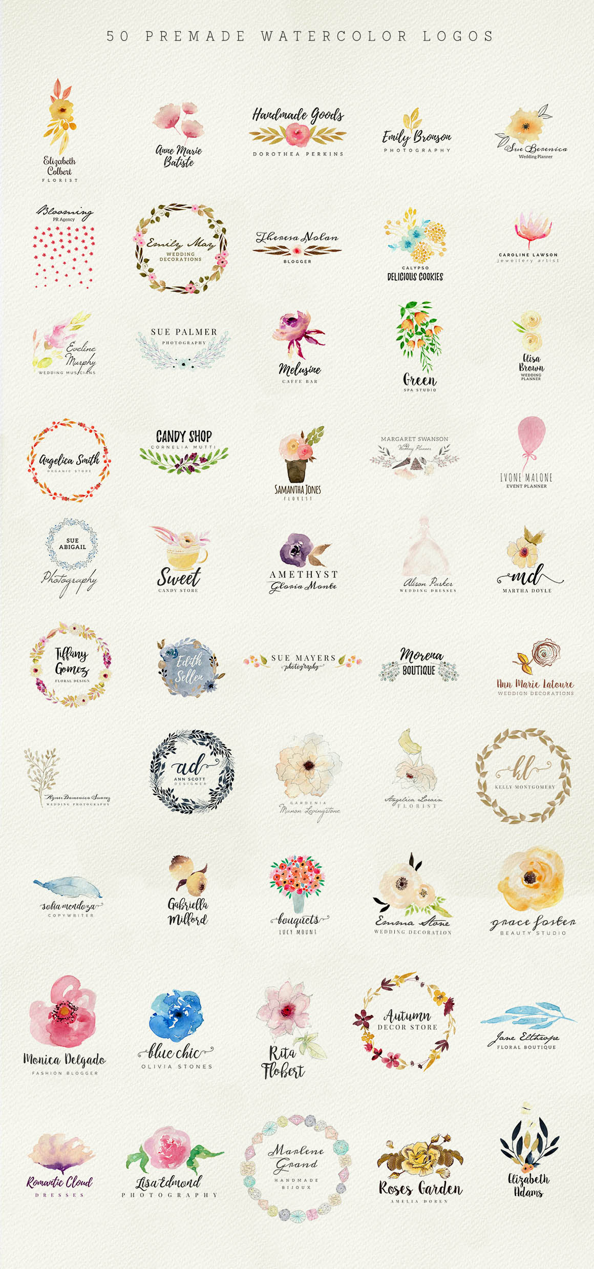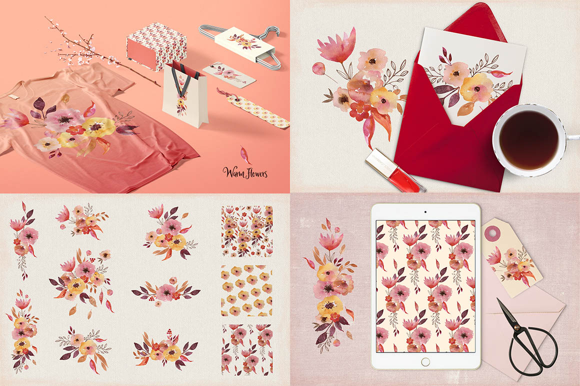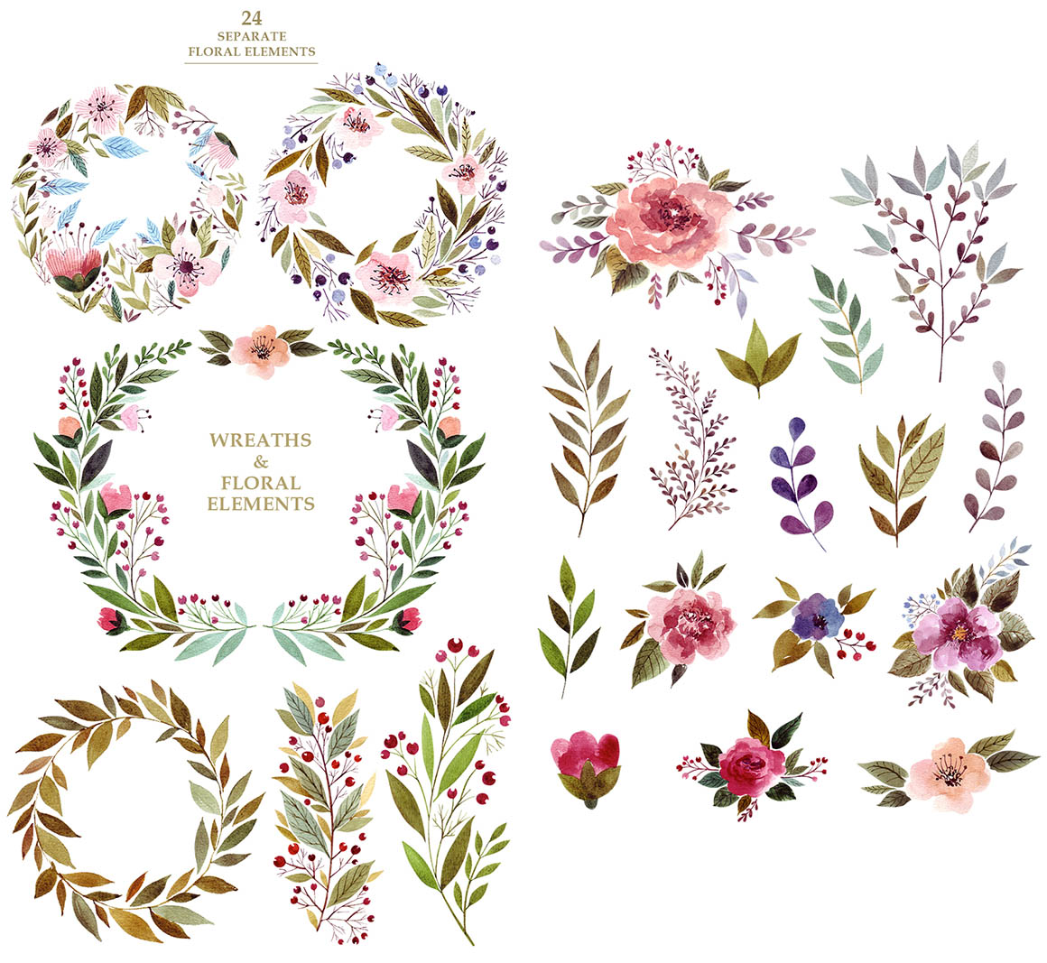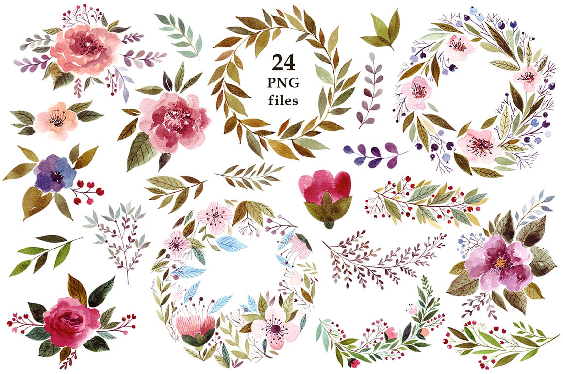 Awesome pack with watercolor flowers and wreaths. Perfect for wedding invitations, greeting cards, art prints, logos, labels, packaging, posters, websites, badges and other.