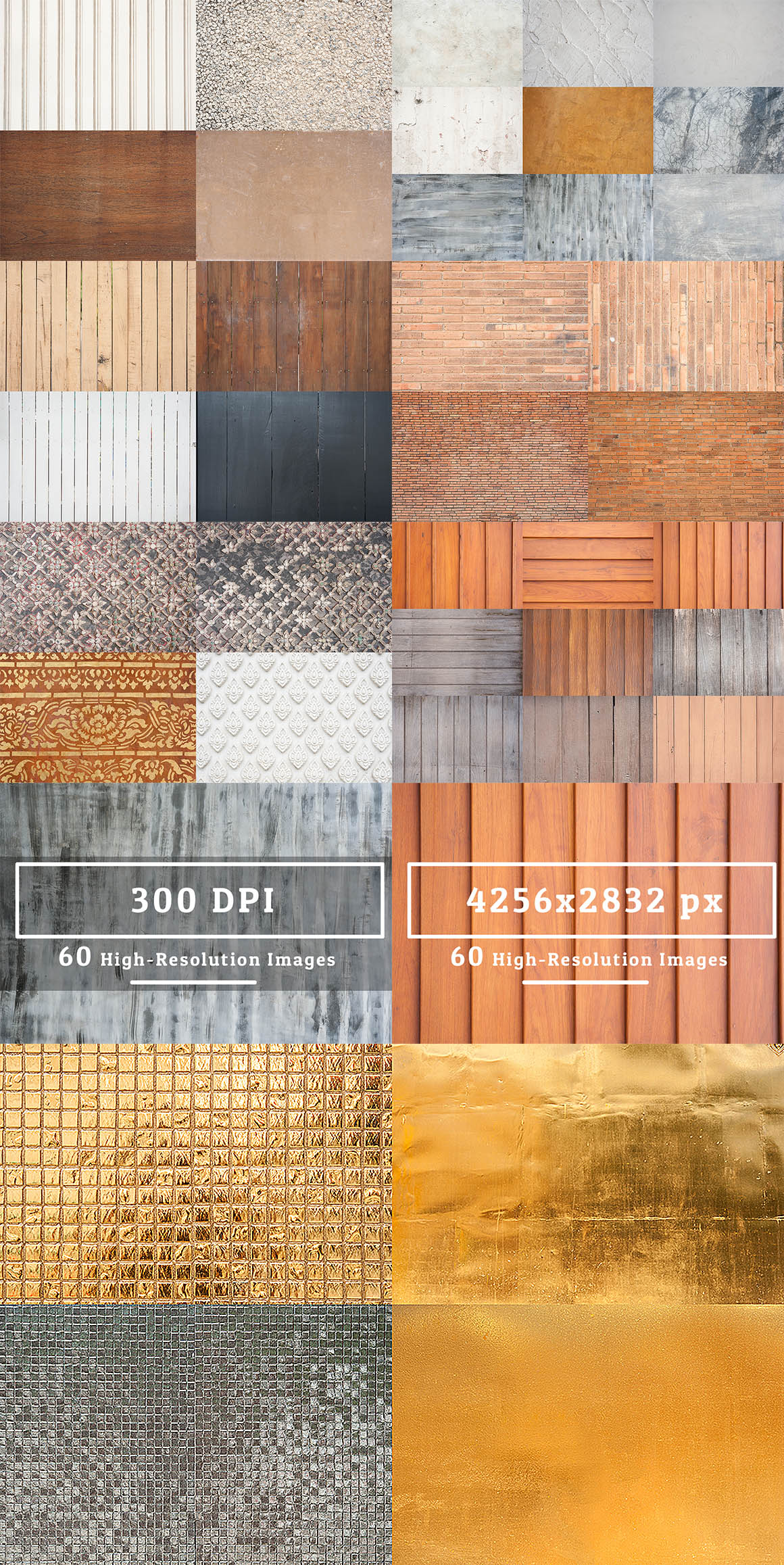 60 Textured Background Images – 60 images high resolution 4256×2832 pixels and 300 DPI each JPG file