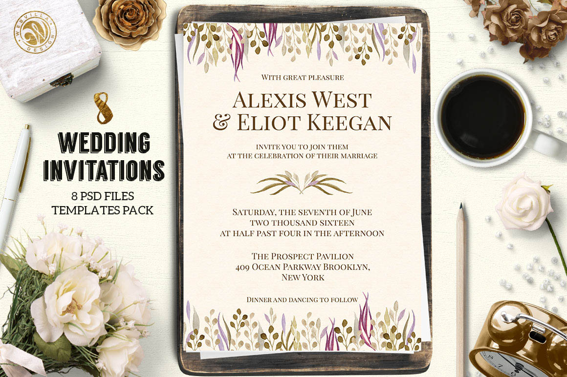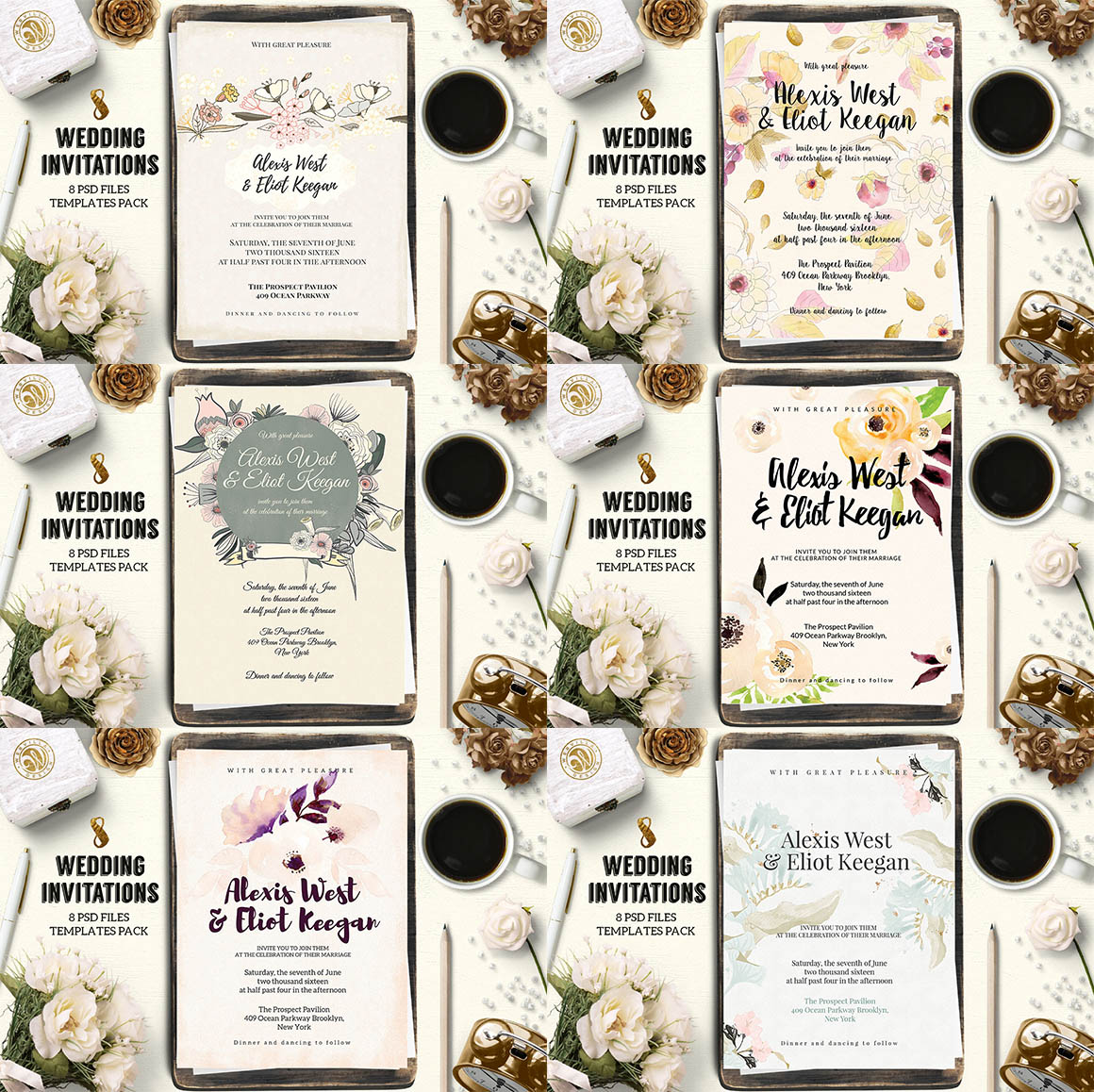 8 Wedding Invitations templates – 8 PSD files – ready to print. Send your guests elegant invitations. In this case you need photoshop. Choose a premium cardstock for more luxury view and sent to your print shop as pdf file. You could edit text, all fonts are free – link is in Read me file.