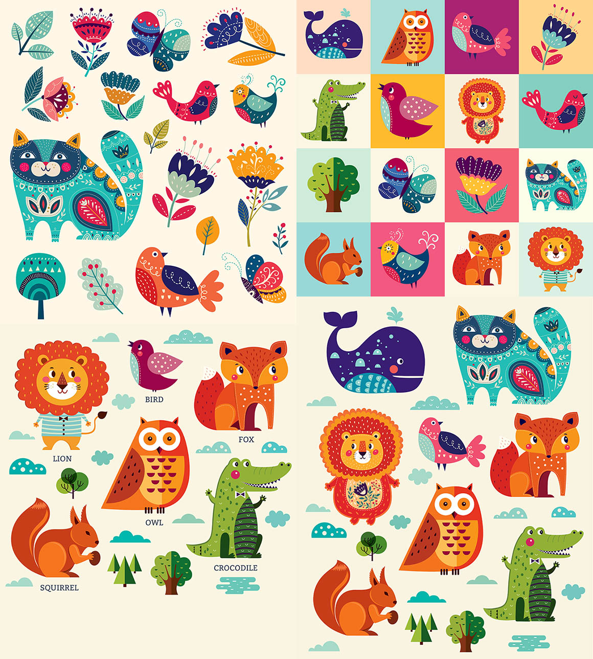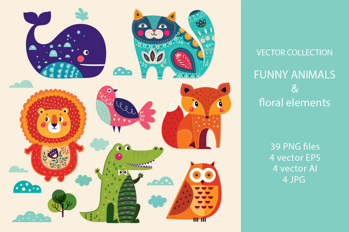 Big collection with lovely funny animals, flowers and leaves in cartoon style. Beautiful cards with cute cat, whale, birds, lion, butterflies, fox, crocodile, owl, squirrel, trees, flowers and leaves. Perfect for greeting cards, art prints, posters, packaging, wallpapers, websites, logos, labels, stickers, stationary and other projects.