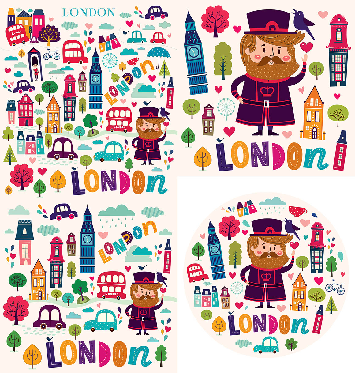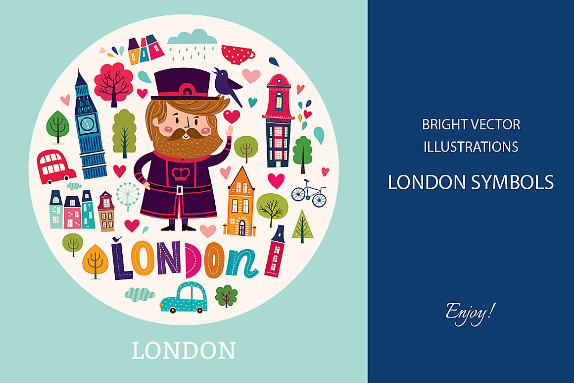 Bright stylish vector illustration with London symbols and landmarks in cartoon style. Perfect for greeting cards, labels, packaging, stationary, posters, and other.