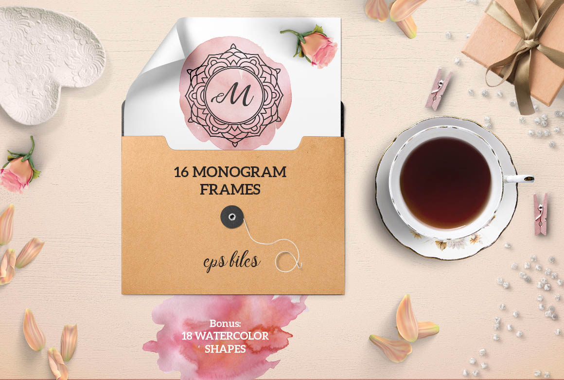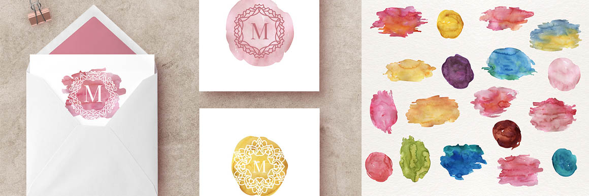 18 watercolor shapes as background of monogram, png files, 300 dpi (size: 3 x 5″)