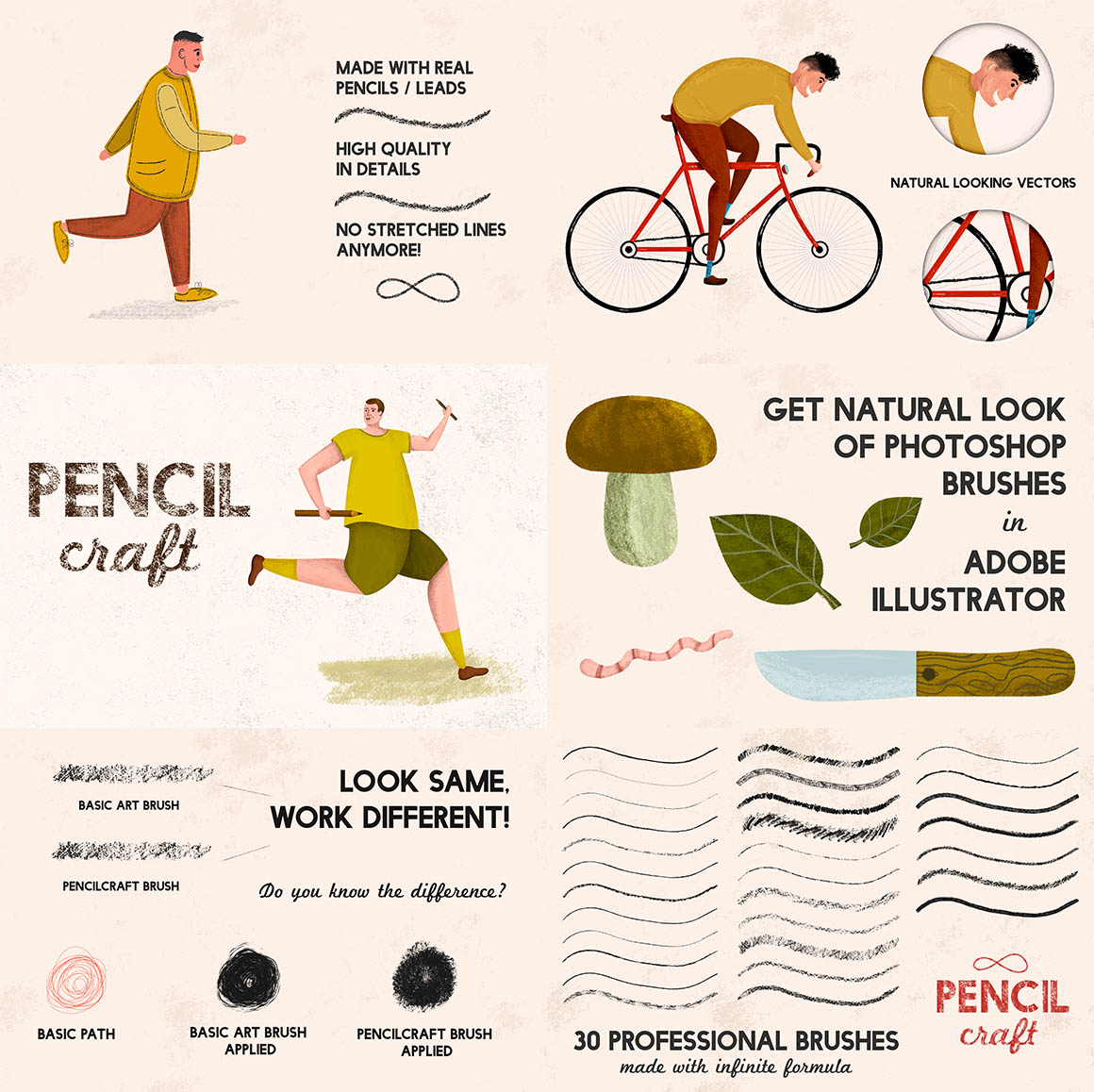 Get most natural looking vector illustrations with Pencilcraft Brushes for Adobe Illustrator. You don’t need to switch to Adobe Photoshop for a more natural look of your illustrations! Now you can make it into Adobe Illustrator and you will get high-quality results – all in vector! All brushes were made by hand with real pencils and leads. These brushes not only looking great and natural, they are infinite! With Pencilcraft brushes you don’t have to care about its length, there are no stretched strokes anymore! Check the promo images for examples and you will see difference between basic brush and Pencilcraft brush!