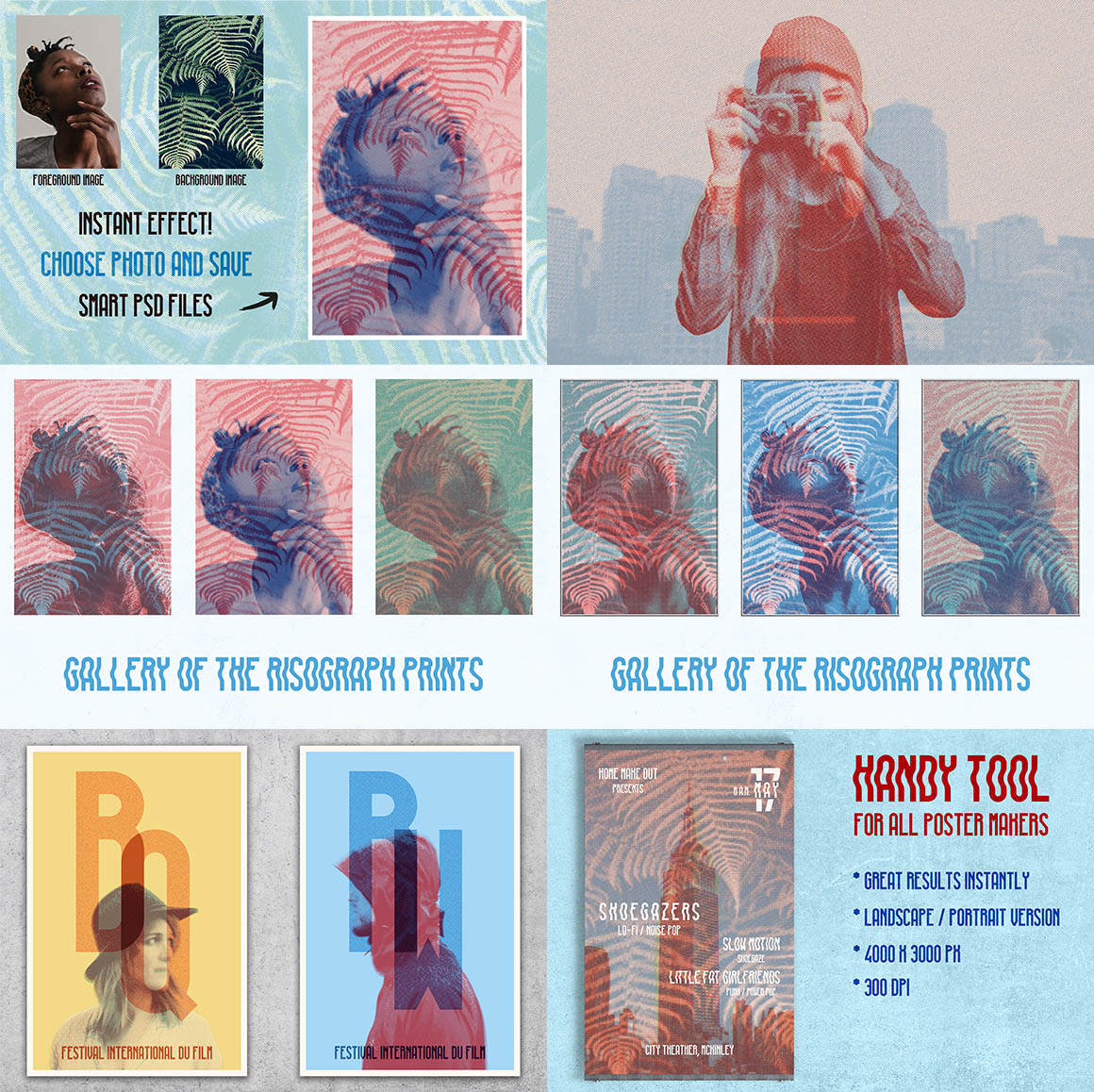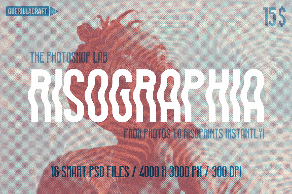Risographia by Guerillacraft is an unique system of smart ADOBE PHOTOSHOP files that help you make prints with risograph look instantly! It’s very useful tool for an every poster artist. You only need to place your photo to smart object and save it! You can change the color of Risograph layers or adjust a density of the effect to get a great result! It’s not only basic Risograph! You can choose from 16 playful effects to make astonishing artwork. I made nine-page “Owner’s manual” that helps you with first steps.