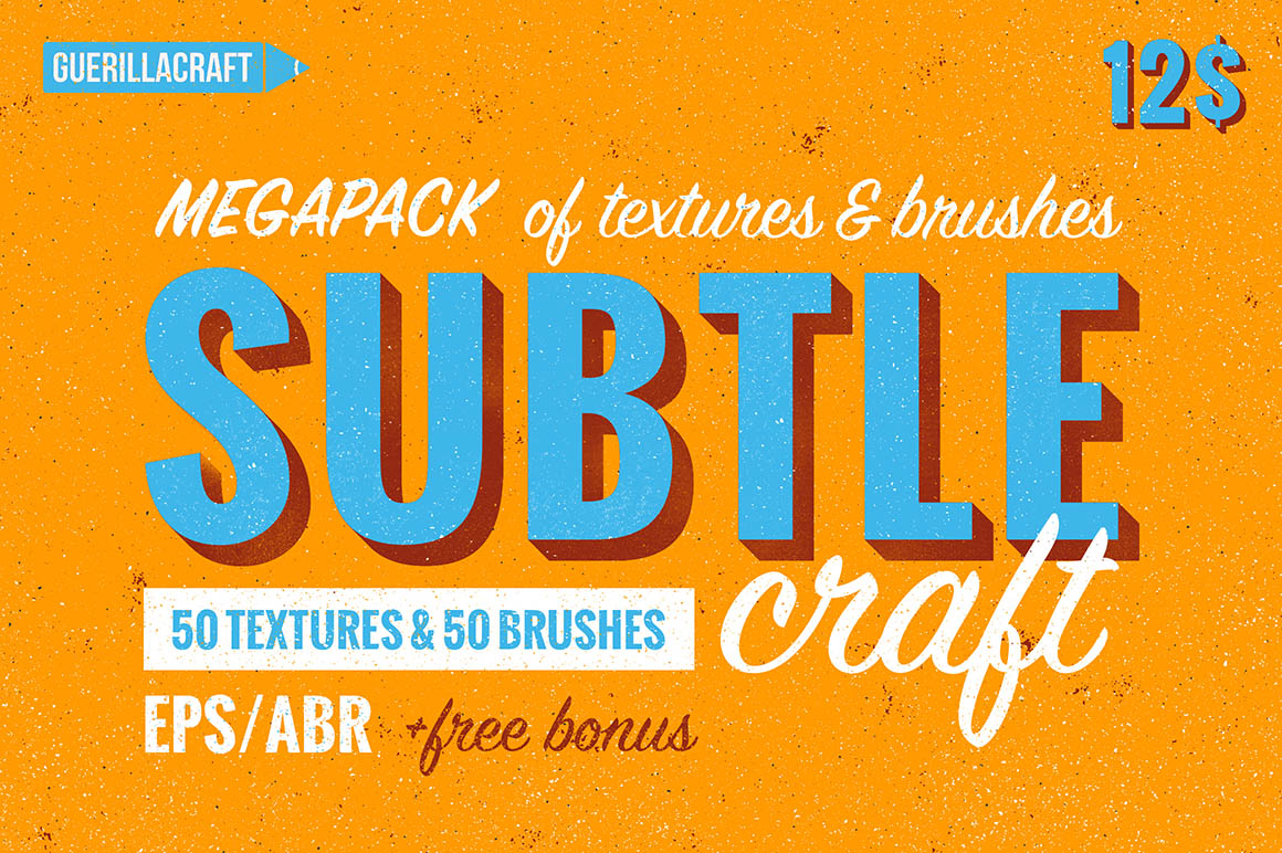 The ultimate megapack of Subtle .EPS textures and Photoshop Brushes by Guerillacraft! As many designers, I often use subtle textures in my design to achieve nice retro effects. For some time, I have collected a great pack of various subtle textures, that now I am bringing to you. Every texture is in a vector .EPS format. It works in Adobe Photoshop as well as Adobe Illustrator. You don’t care about the size of your design, all is perfectly scalable! For finishing touches, you have a collection of 50 Photoshop Brushes – from 350 to 1400 PX. Just add texture and make some corrections with brushes. Easy to use!