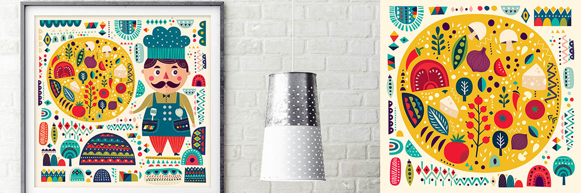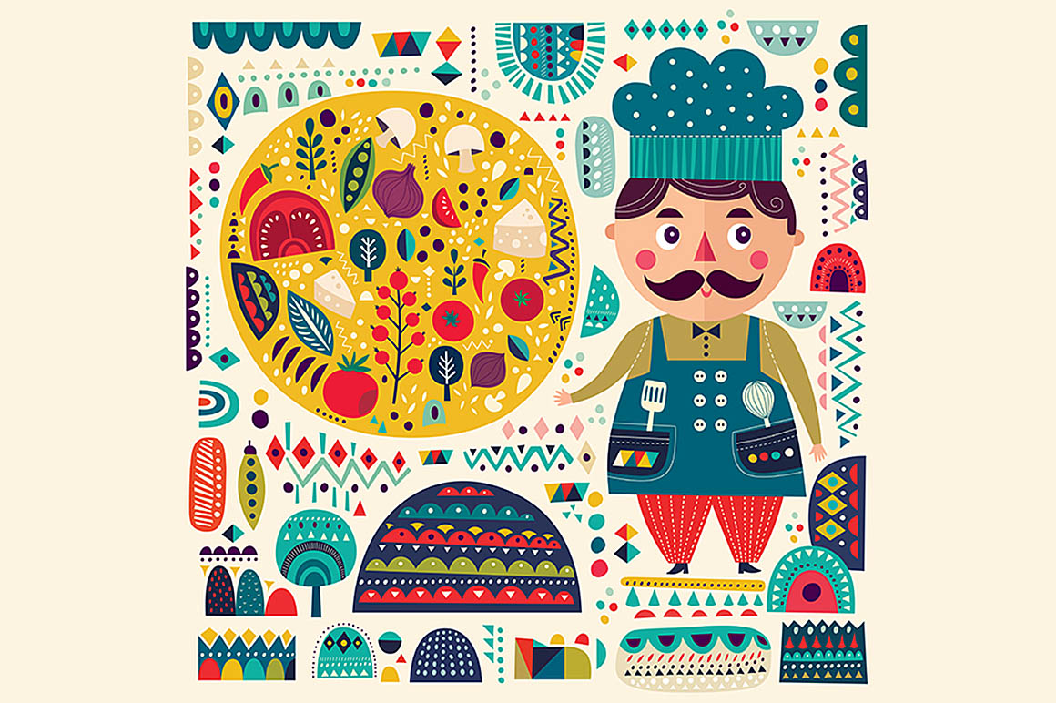 Art vector colorful illustration with pizza and funny chef in original style. Art poster for decoration your interior and for use in your unique design.