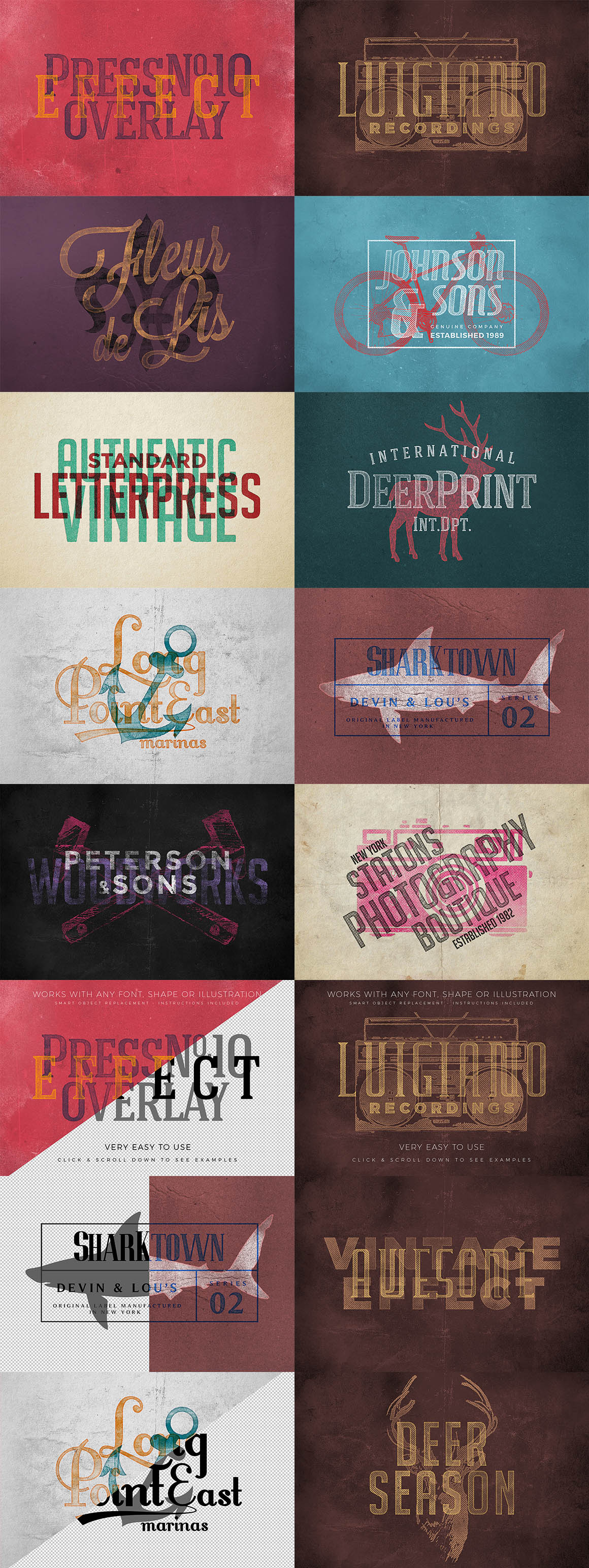 7 Adobe Illustrator Styles for instant retro & vintage effects! The easiest way how to get an effect of vintage mural advertisings! This collection of 27 styles for Adobe Illustrator is full of great effects inspired by Ghost signs – old grunge street advertisings painted on a wall. With few clicks, you will get a real vintage effect. The styles are based on a combination of graphic styles and Adobe Illustrator actions. It’s a very effective way how to use textures and save your time. With 8 scatter vector brushes you can make another adjustments and add extra details to your work.