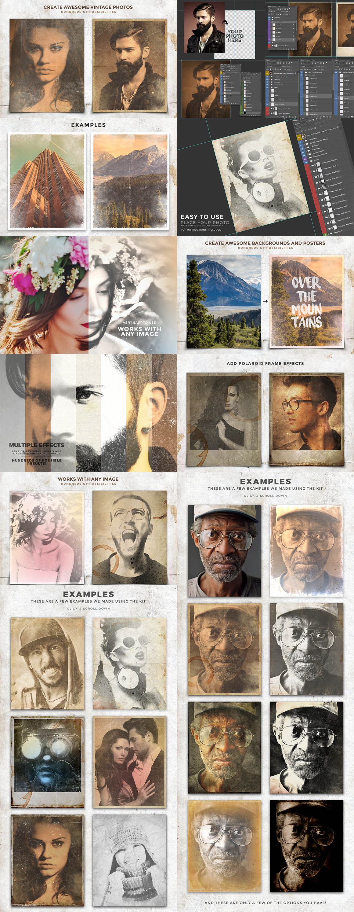 Transform your images into awesome vintage photos for your next projects! Either you need a facebook cover or you are working on a new poster or a t-shirt print, these effects will help you finish the job faster! It works with any type of photo as long as it’s not too dark or not too light. Too dark or light photos migh not look very good because of the low contrast. Included is only 1 PSD file with everything in it! Fully layered, color coordinated and very well organised, and 1 PDF file with step by step instructions. Polaroid photo You can transform any photo intro a vintage one and then make it look like an old Polaroid photo with 2 click! Very easy to use, this photo mock-up works with smart objects. All you need to do is paste in your photo and then play with the layers available to get the desired effect! It’s as simple as a few mouse clicks! Step by step PDF instructions with images included!