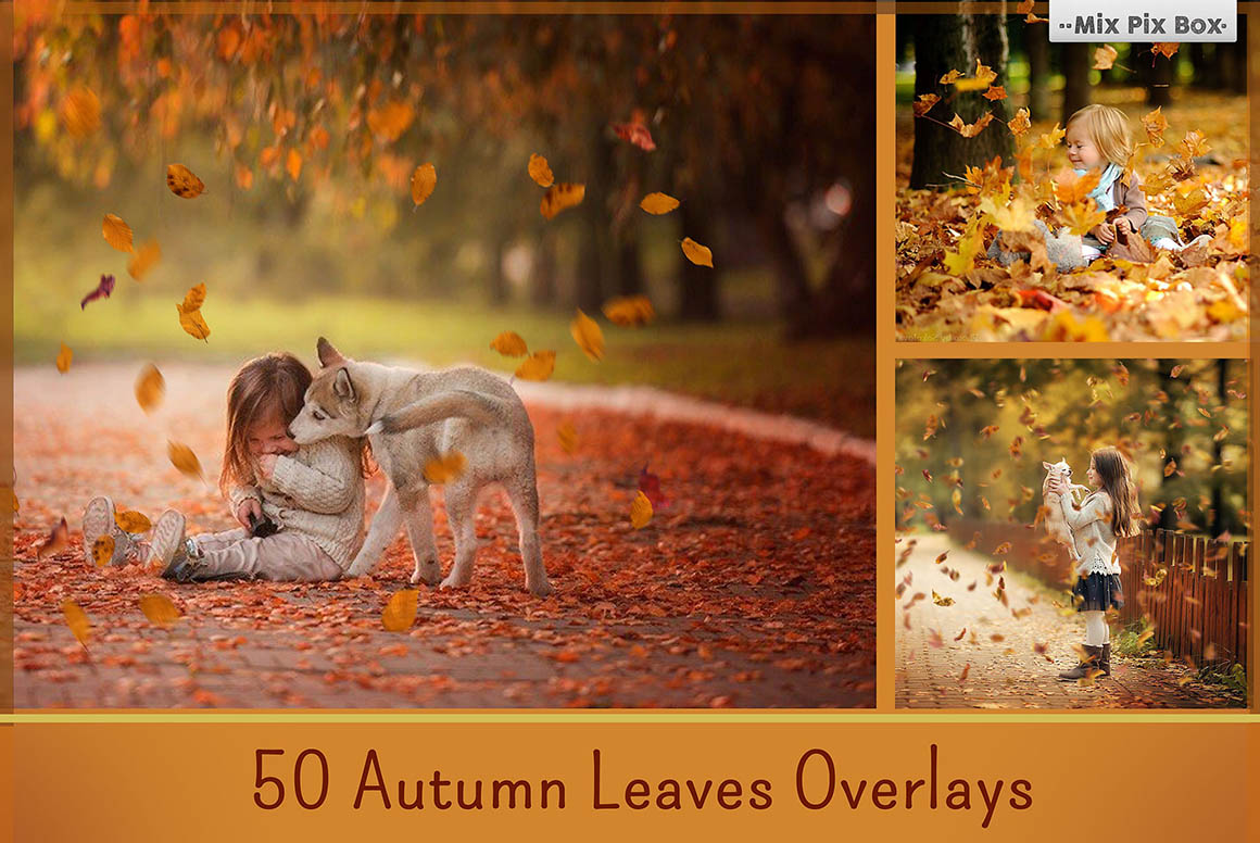 32 Realistic falling leaves overlays with transparent background. High resolution (5100x3450px – 300dpi)