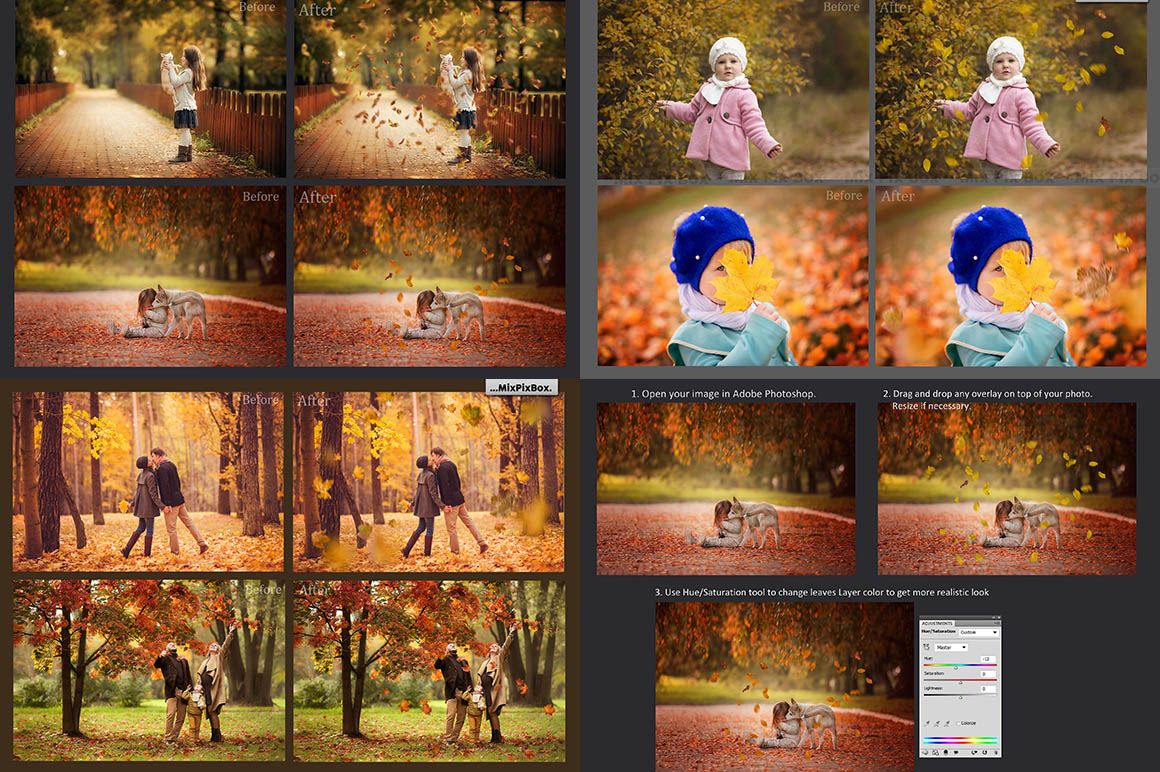 Autumn Falling Leaves Overlays set. Best for autumn pictures. All files are in PNG format with transparent background. Easy to use! Instructions how to get more realistic look step by step included.