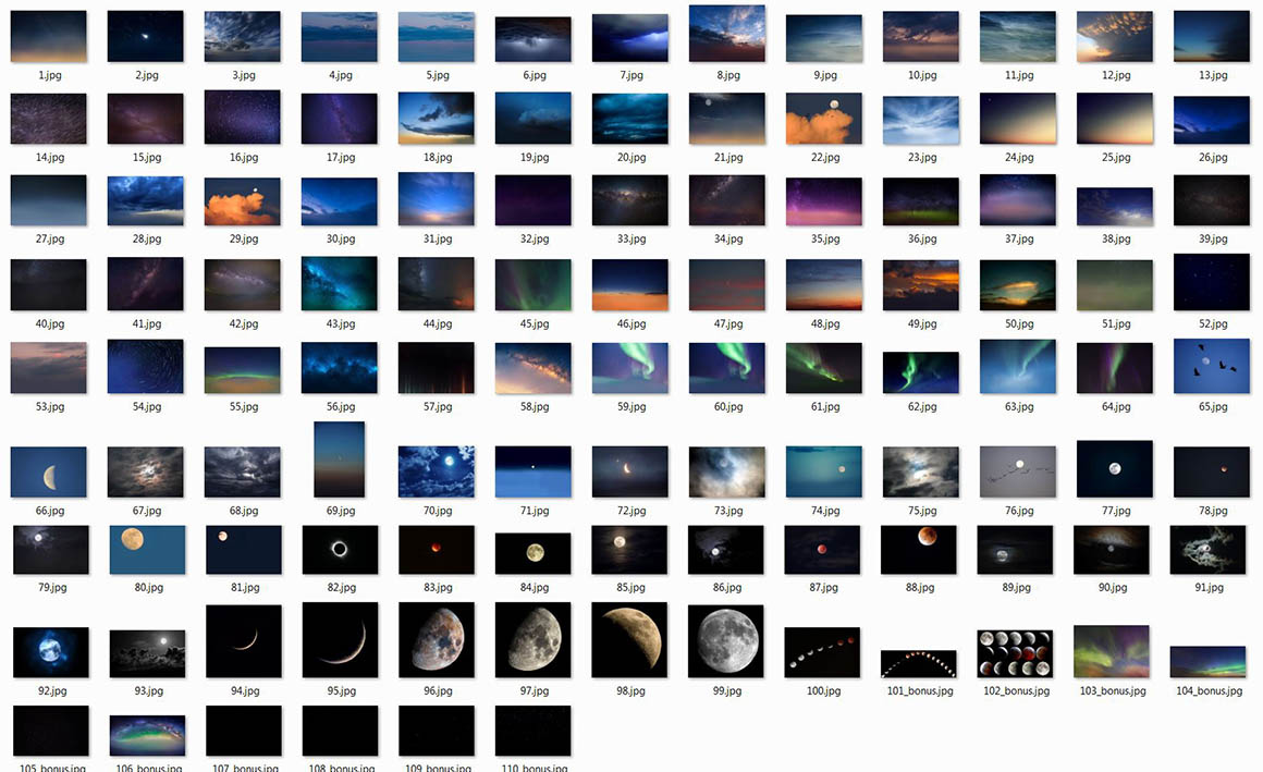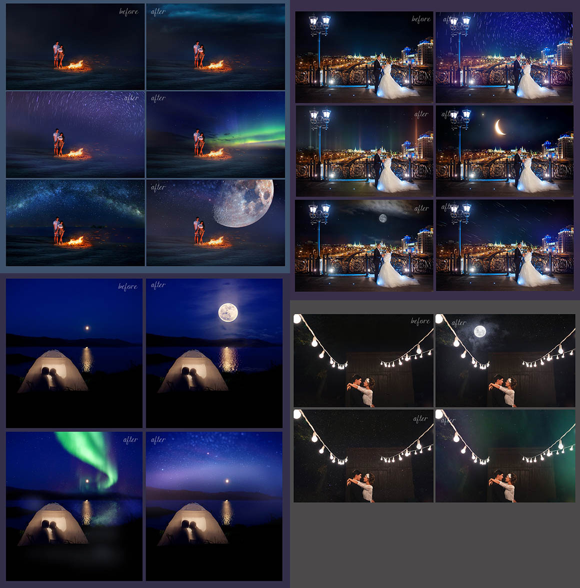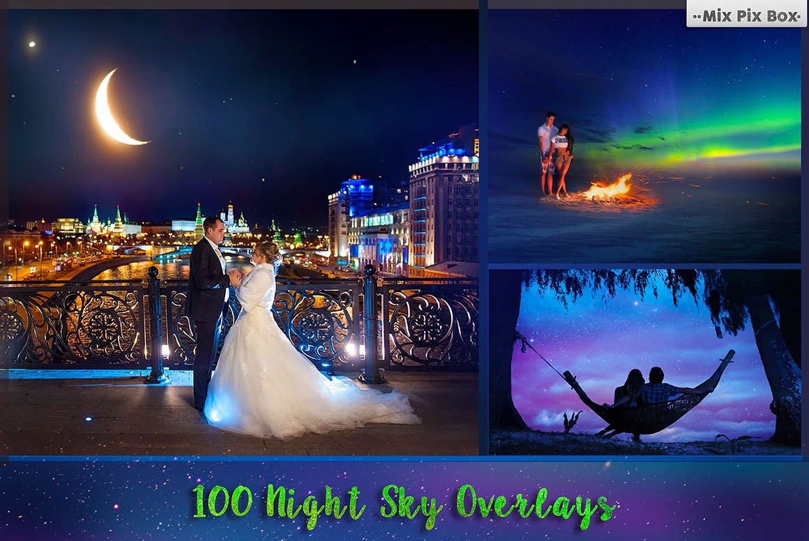 100 Night Sky photo overlays high resolution (sizes are different approx 4500x2700px at 300dpi jpeg) Easy to apply ( Tutorial is included )