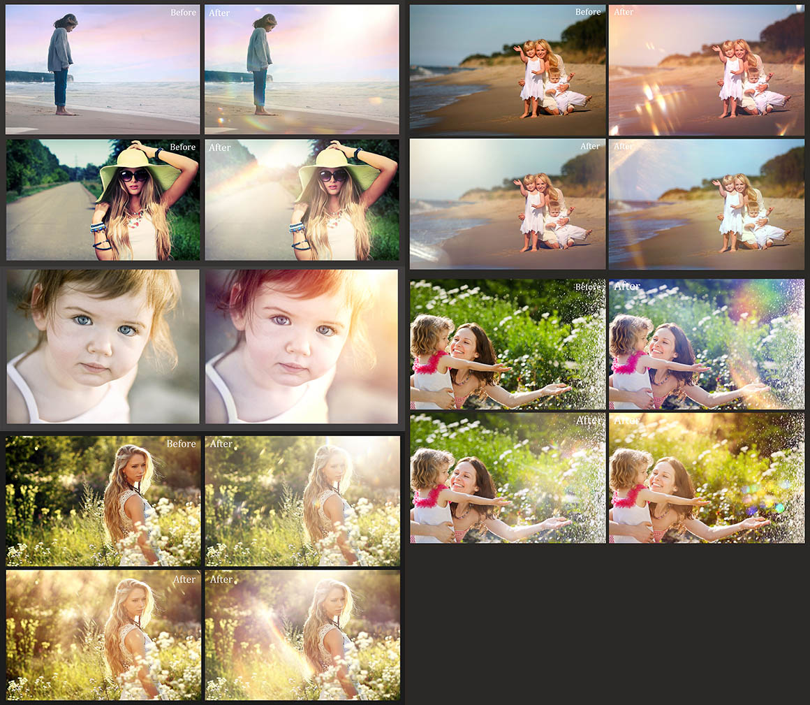 This set contains Sun Flare, Haze and Sunbeams overlays. Look at the preview “Before/After” and find out how you can improve your photos by using these creative Overlays. It is very easy. Step by step tutorial included. Simply place overlay on top of your image, change mode of the overlay layer for SCREEN and that’s it! **You will need basic knowledge of Adobe Photoshop and know how to work with the layers.