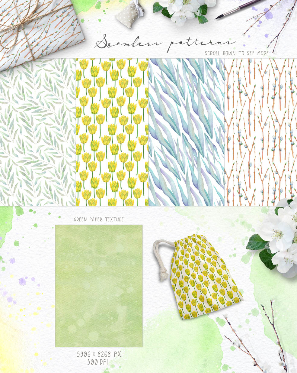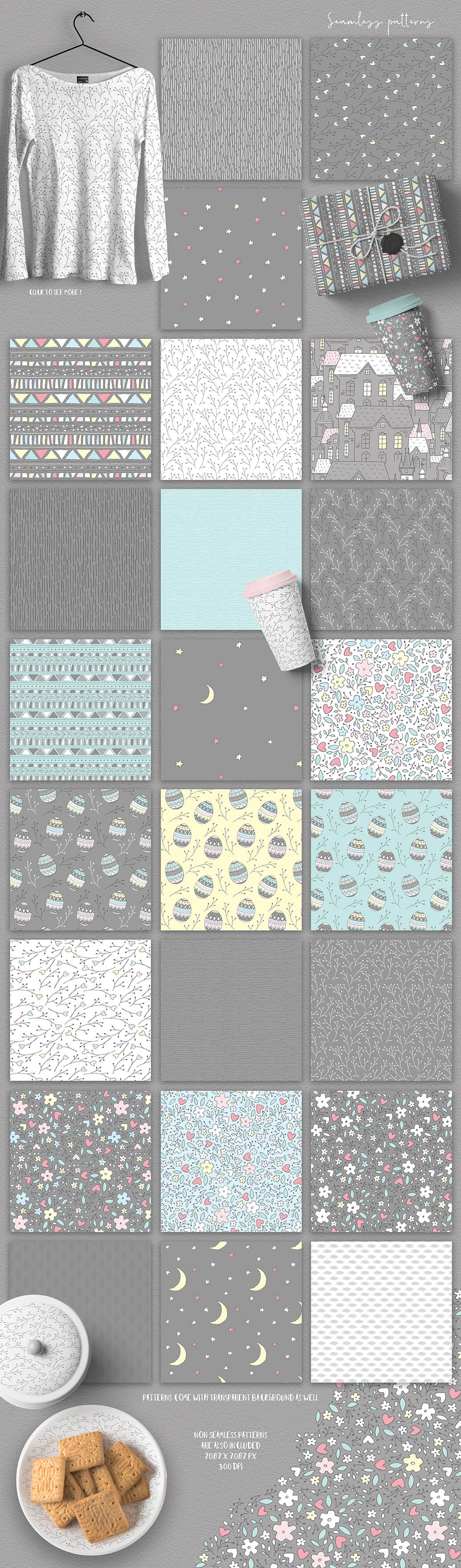 - Seamless patterns (6 PNG, 6 JPEGs)