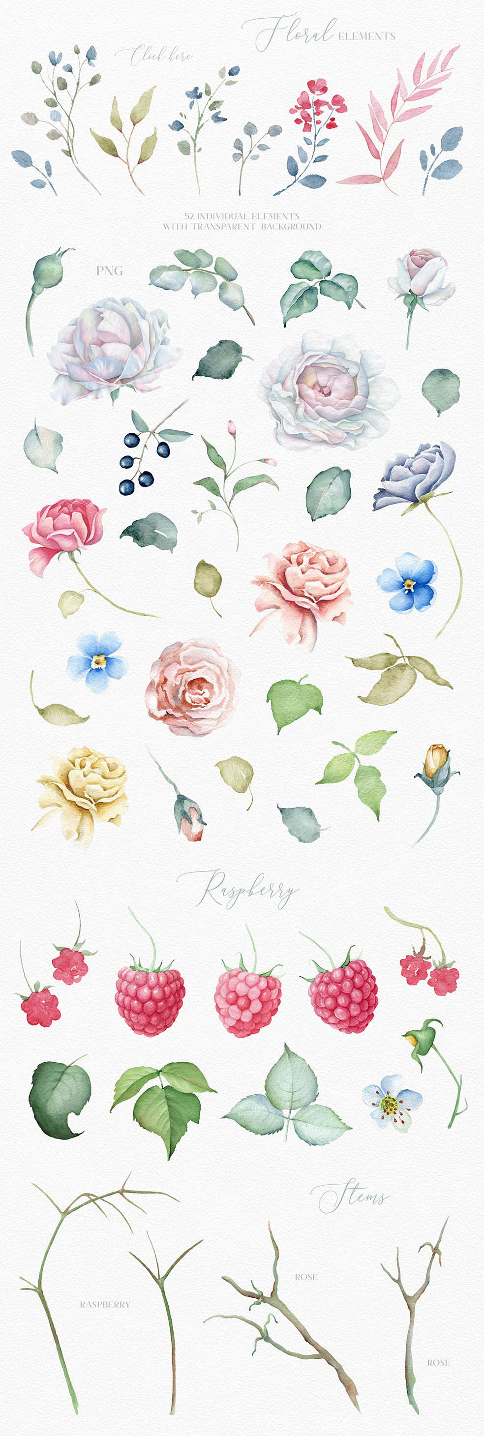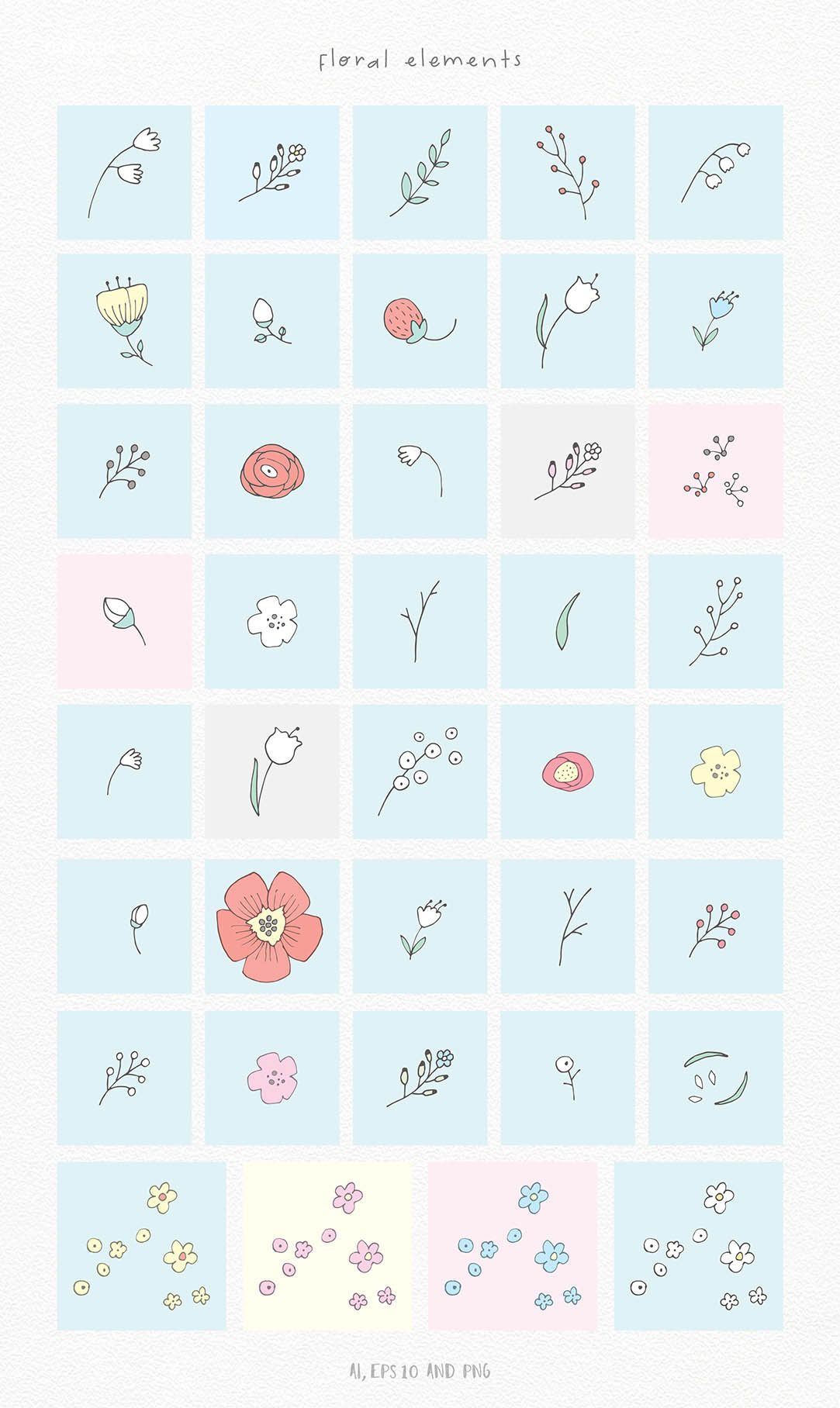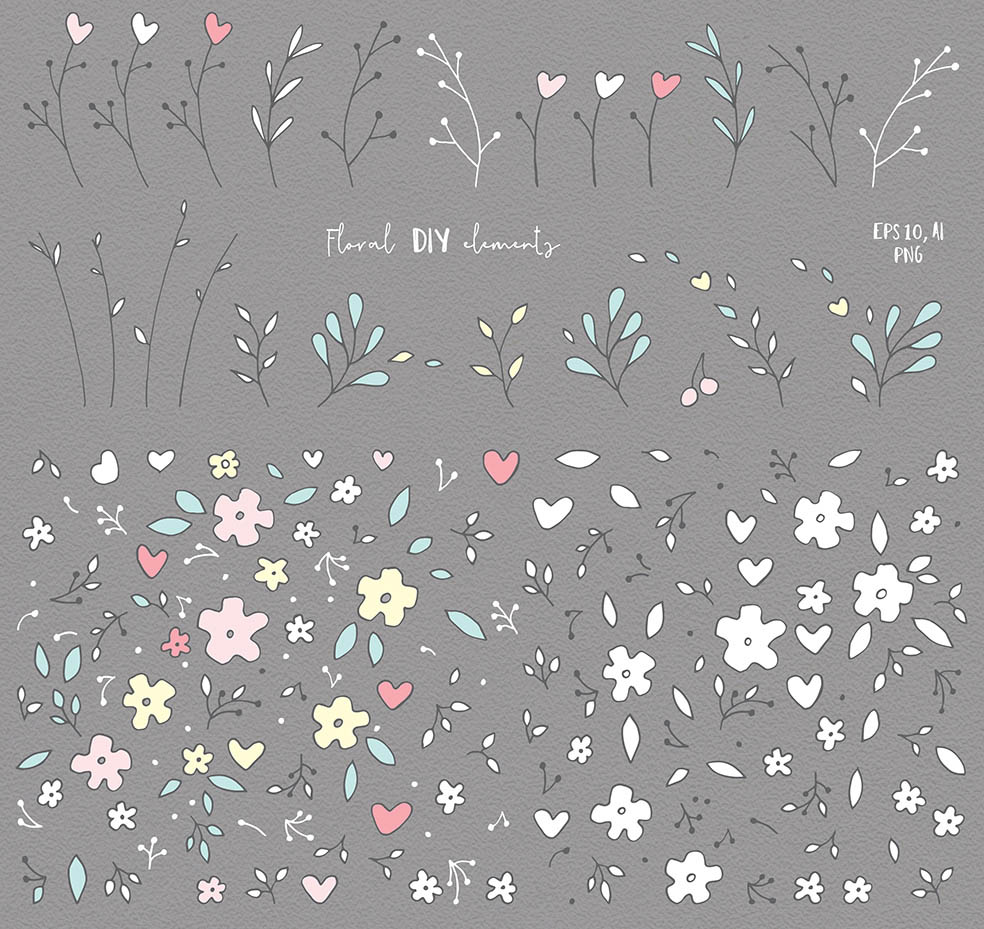 - DIY floral elements: 74 PNG, 1 Ai, 1 EPS