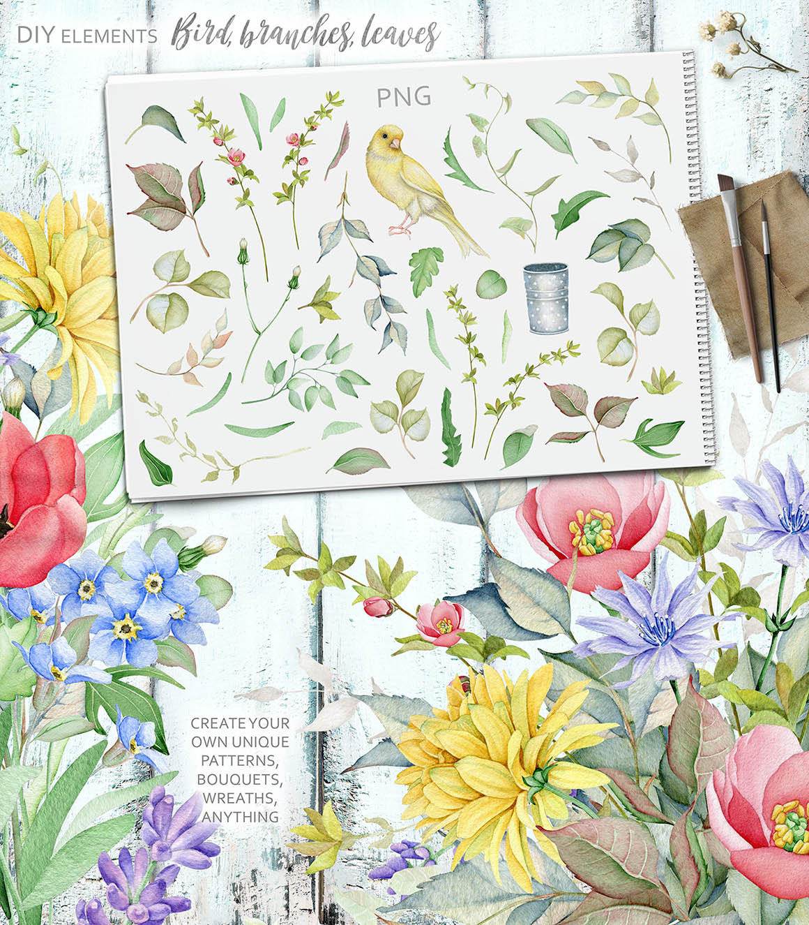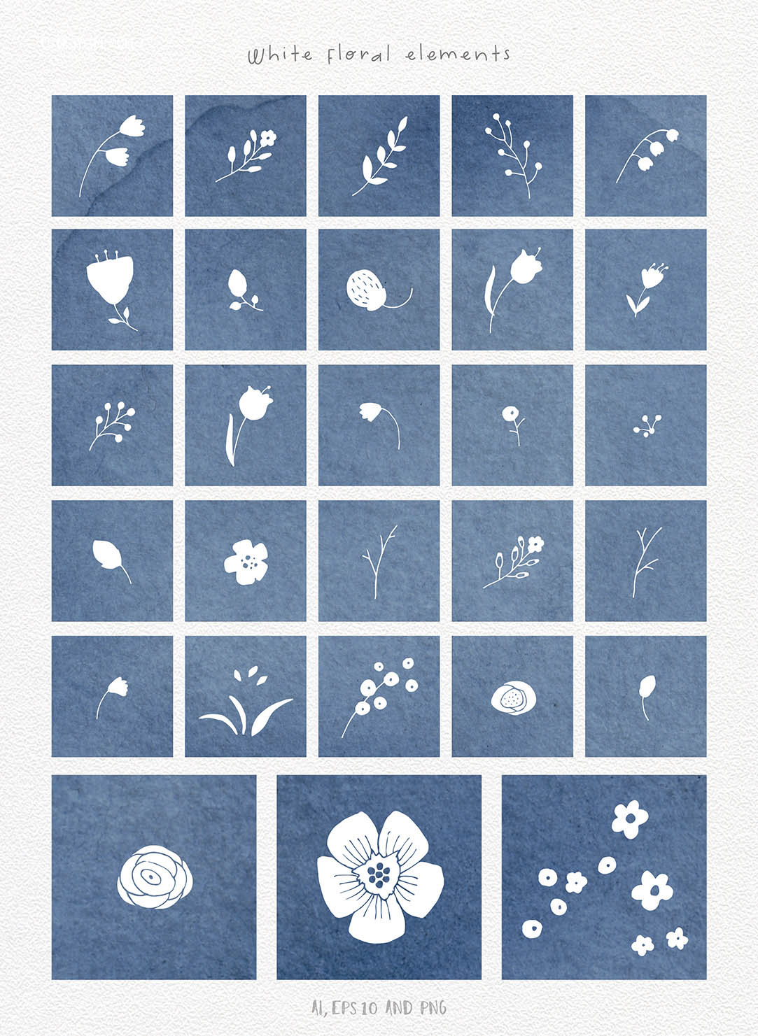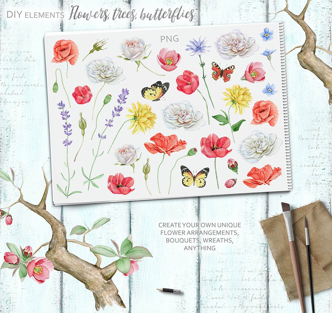 - DIY floral elements: 74 PNG, 1 Ai, 1 EPS