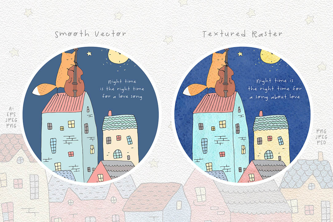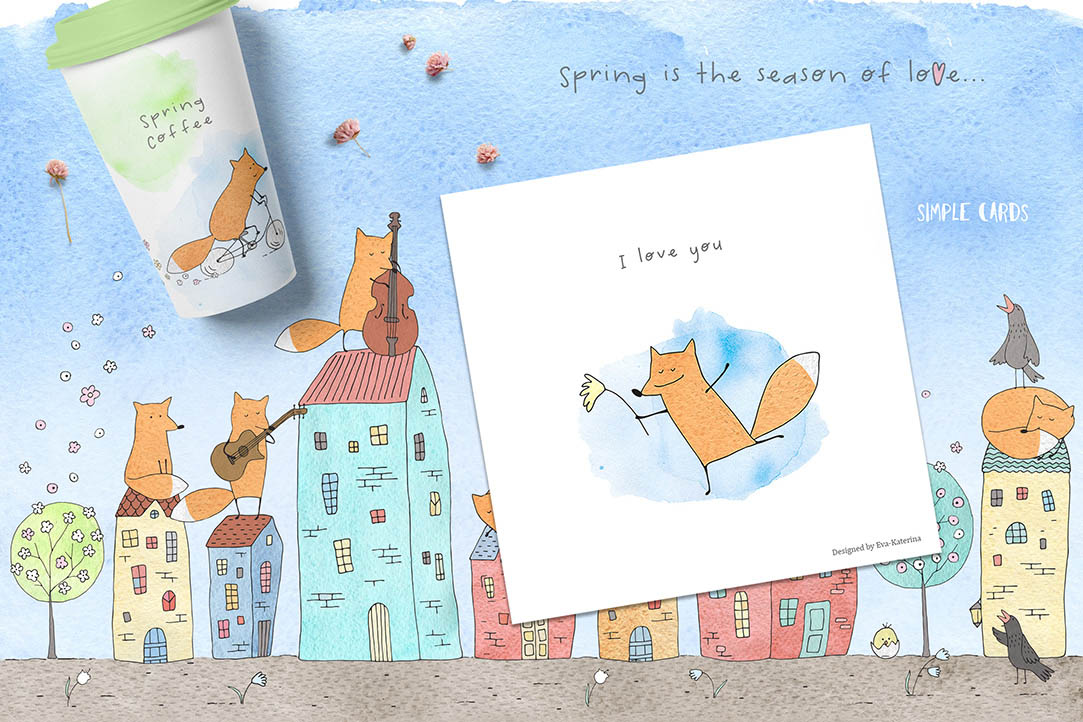 Hi 🙂 Can you imagine your life without music? I bet, you can’t. It’s a language that is used to express our feelings. I hope these cute little foxes-musicians and birds will help you to express your moods and give you joy 🙂 It’s a great way to tell your friends and people you love something nice. You will receive hand drawn funny foxes, birds, houses, watercolor textures, variations and different scenes, wreaths, seamless patterns, pre-made cards.