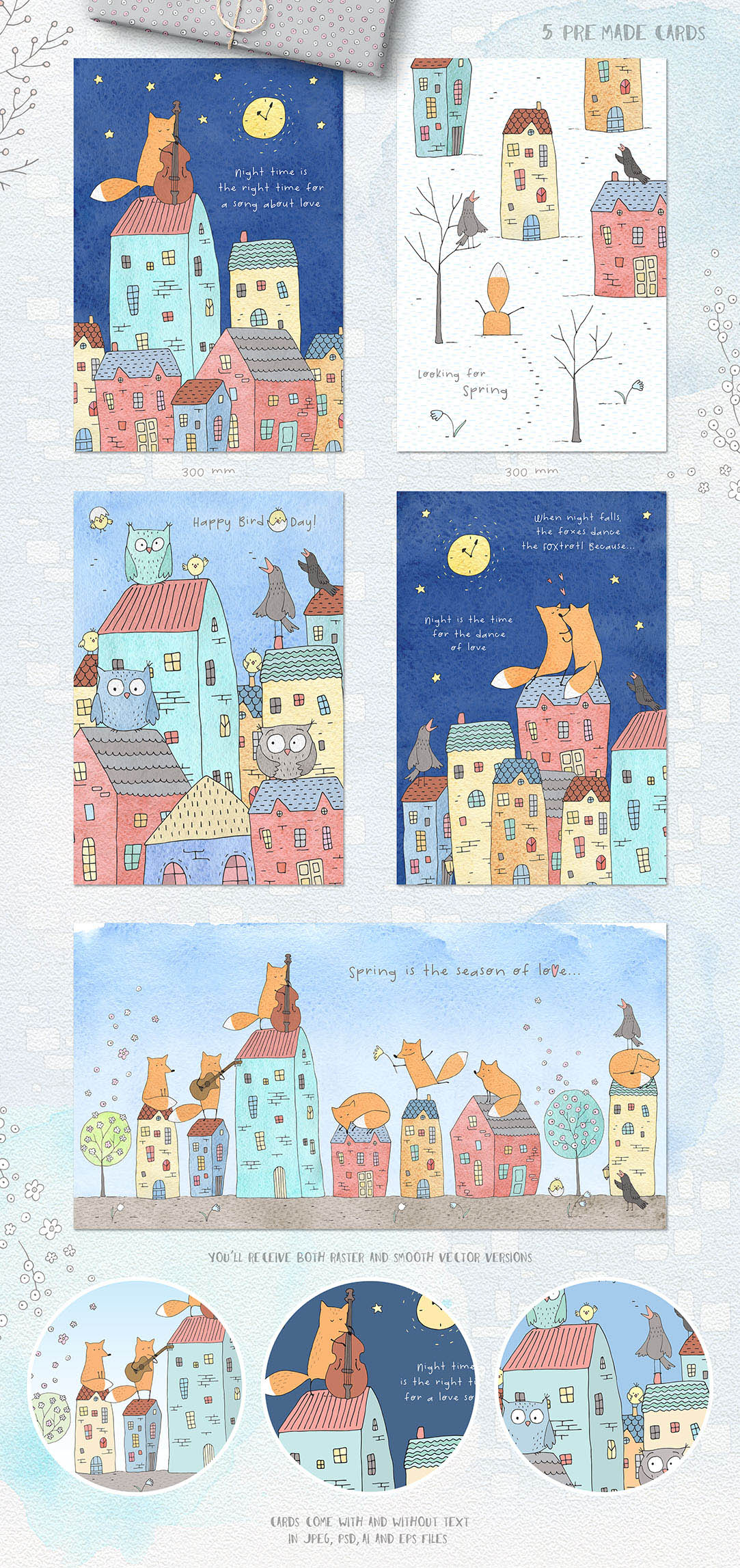- Pre-made cards (smooth&textured): 20 JPEG, 5 Ai, 5 EPS, 2 PSD