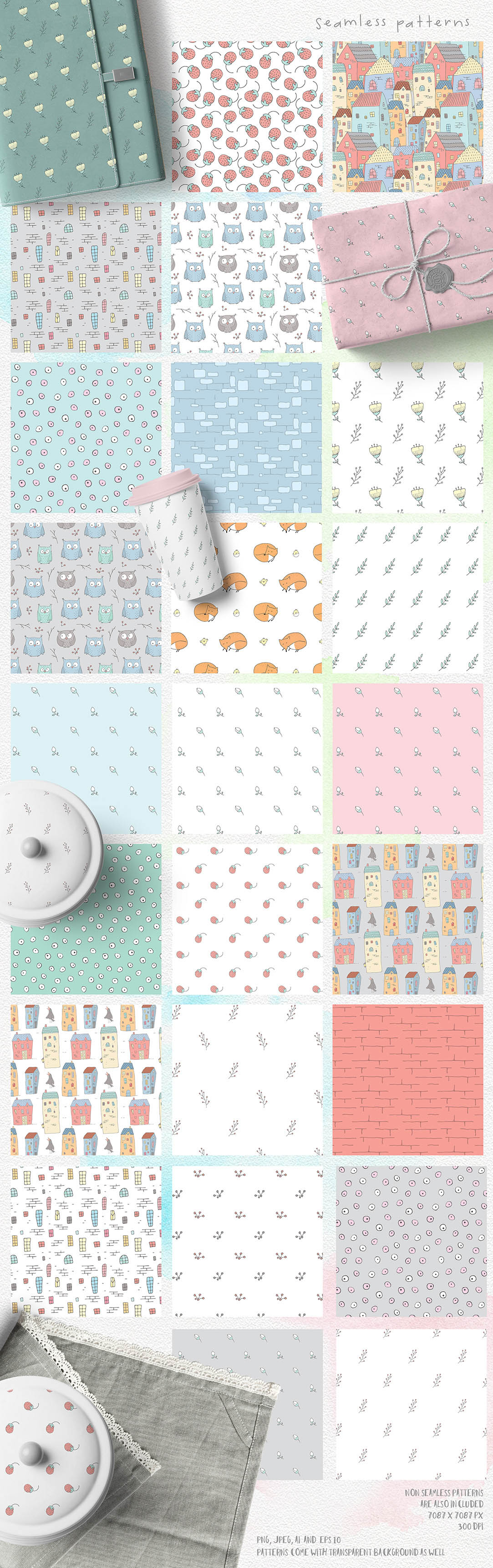 - Seamless patterns (11 JPEG, 4 PNG)
