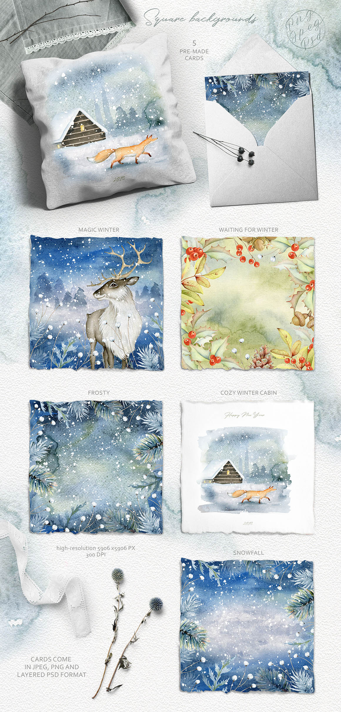 - Textures (2 PNG, 7 JPEG)All files are high-resolution (300 dpi). All elements are on separate isolated layers. Ready-made card templates are layered and available in both PSD and JPEG format (+ additional plain backgrounds in JPEG format). Postcards are in a 5,25’’x7,25’’ format, but their real size is larger, in case you would like to use them for other projects. They have bleed and could be printed on larger sheet and then cut down. Textures are high-resolution JPEG files (+2 PNG).