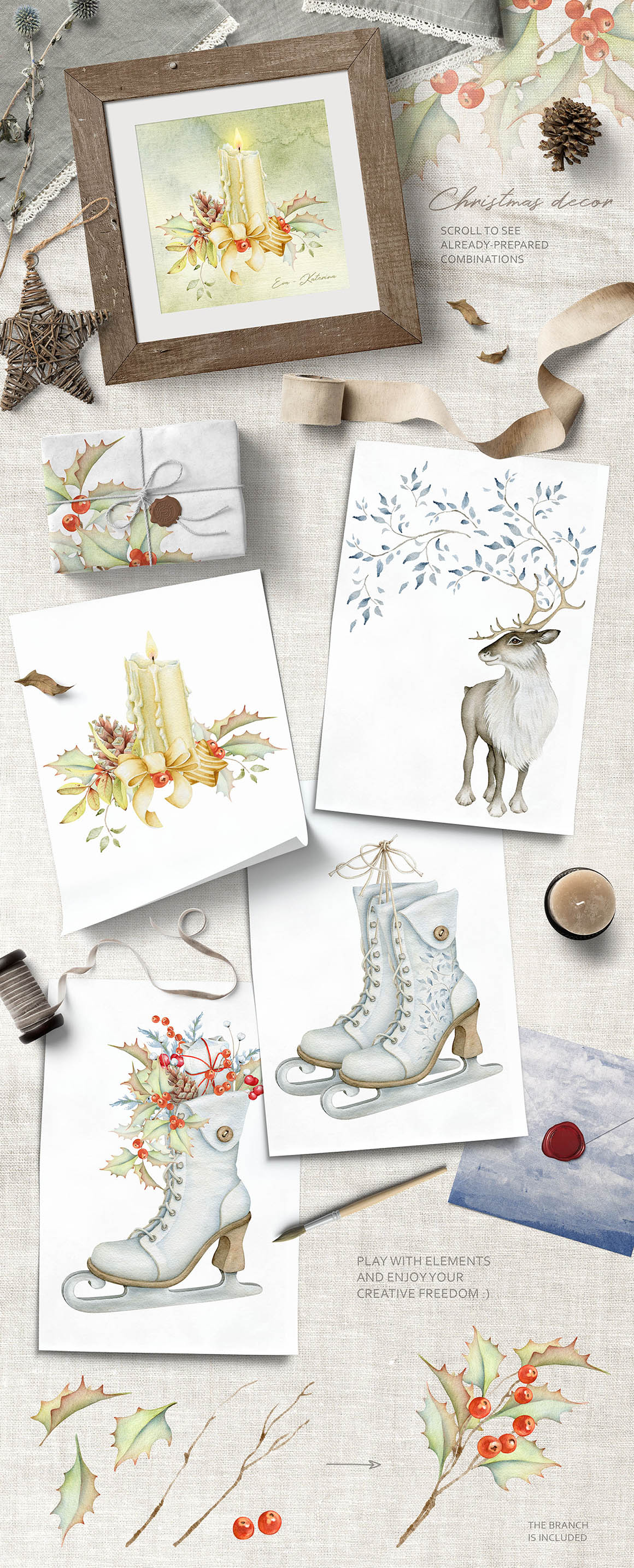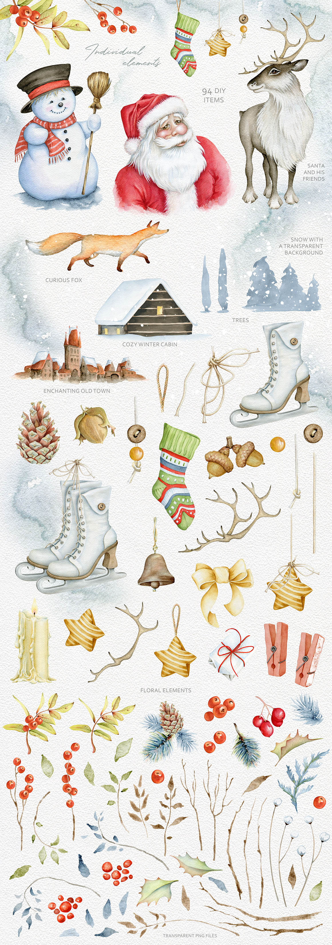 Hi! I’m very happy to introduce to you my winter watercolor set! Please read carefully the description. It’s slightly classic and slightly vintage collection… I hope you love it 🙂 Winter watercolors, cute characters, Christmas images, floral arrangement, wreaths, DIY, textures, backgrounds…. There are 223 items in this product – PNG, JPEG, layered PSD files. Some of the elements can be used any time of the year.
