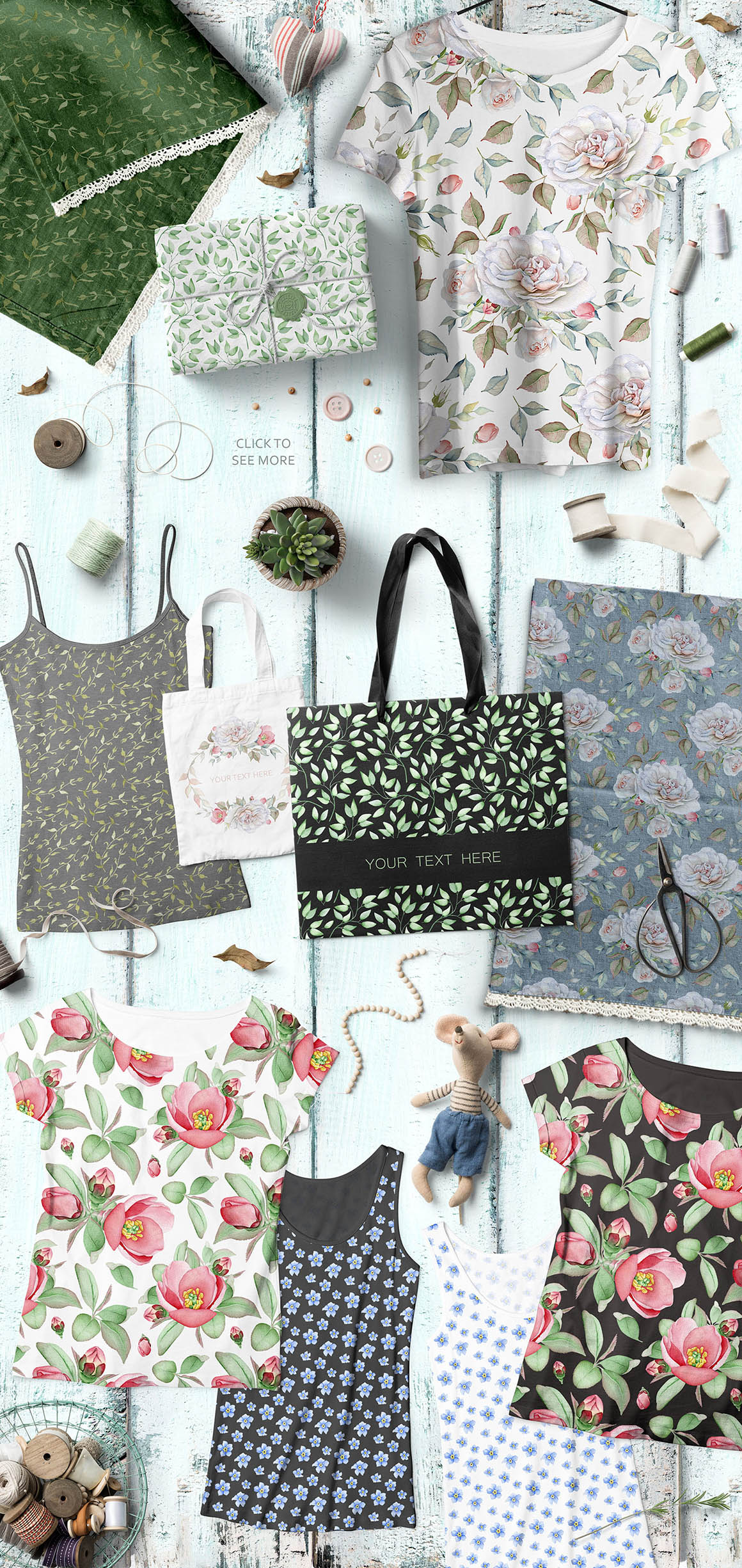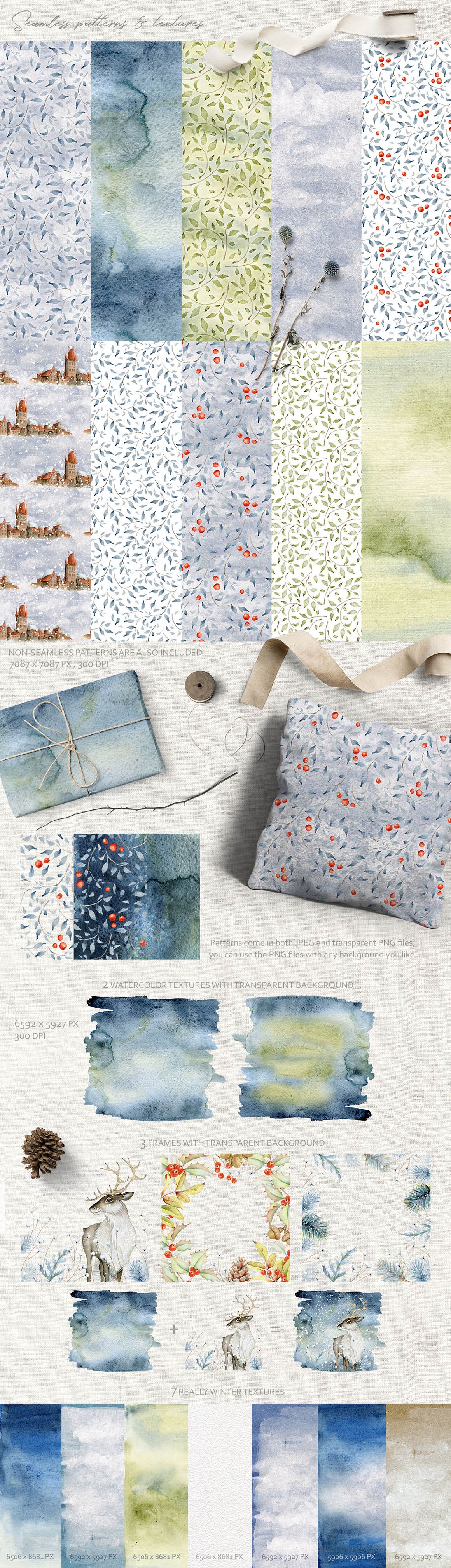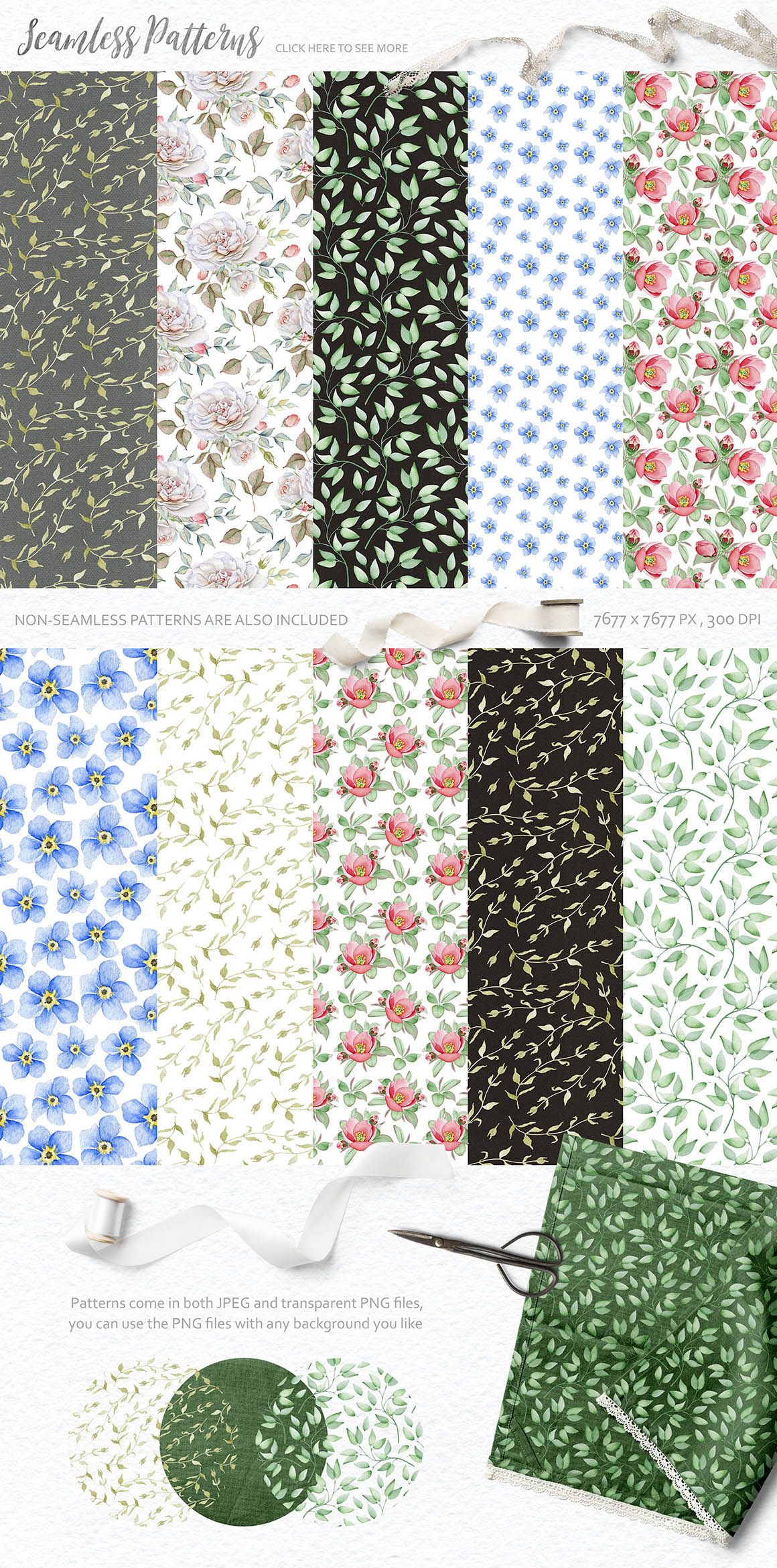 - Seamless patterns (7 PNG, 10 JPEGs)