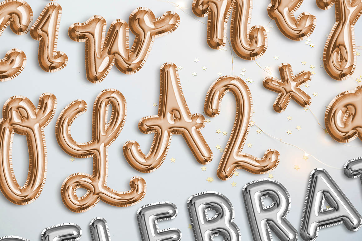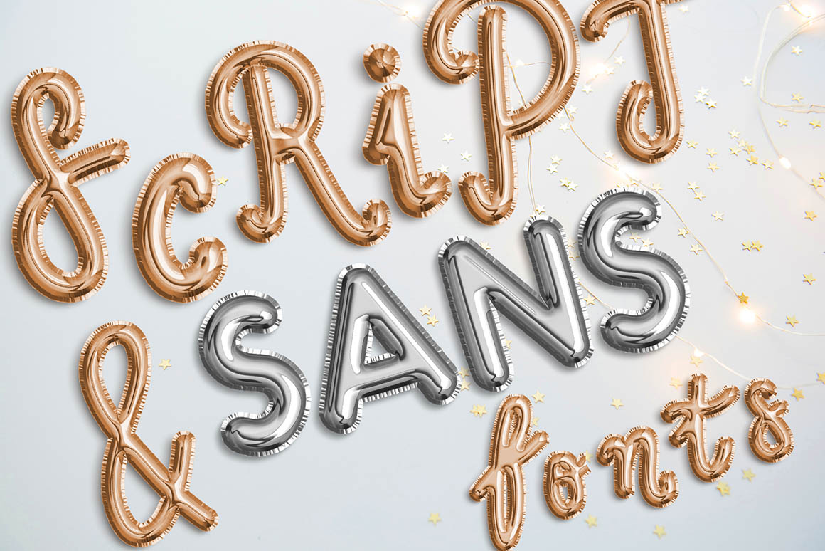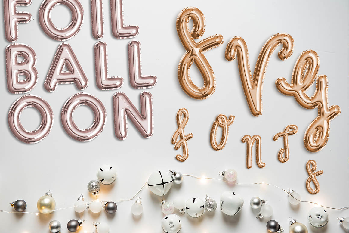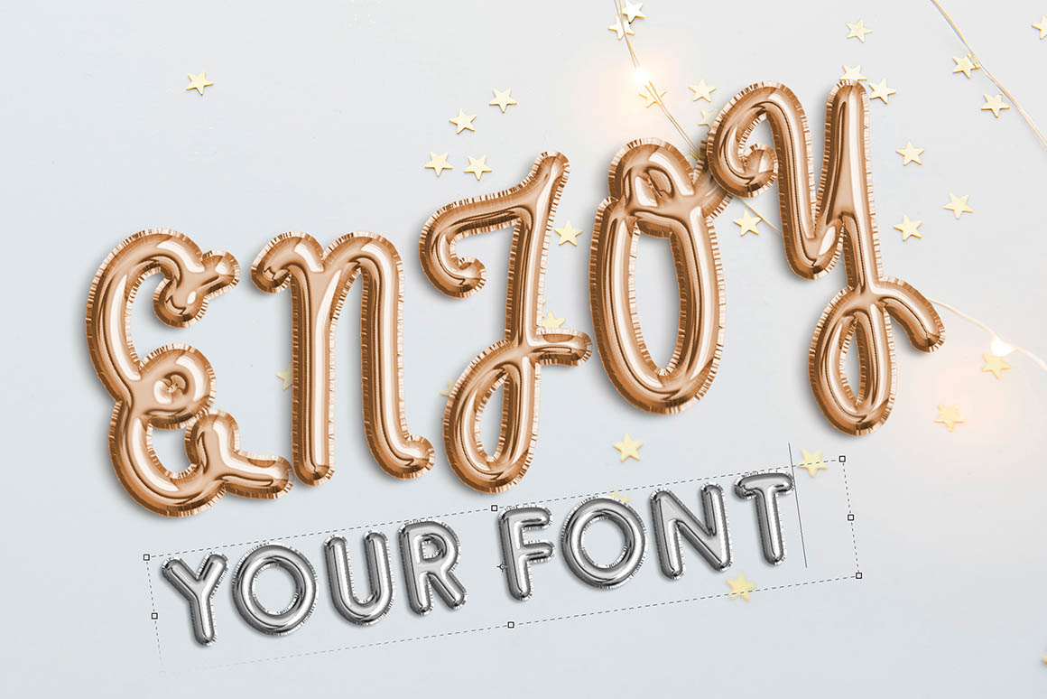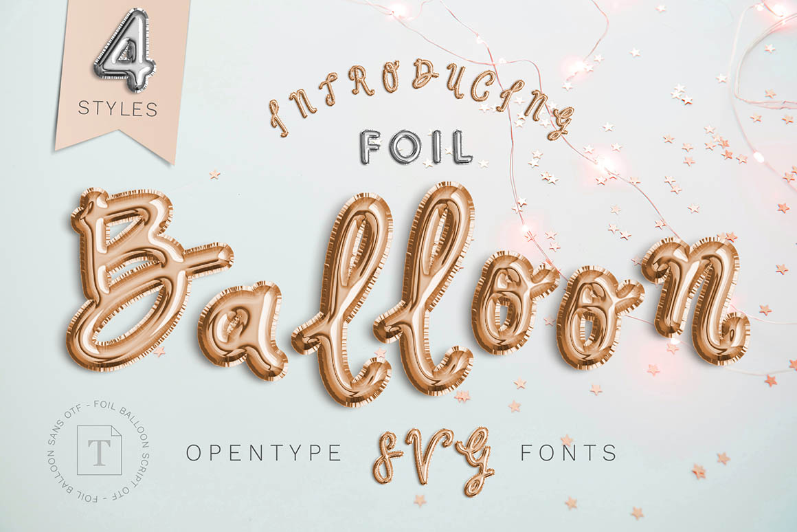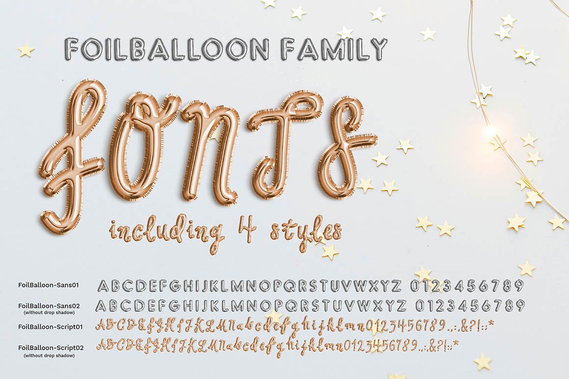 Making Foil Balloon types never been easy like this! It is OpenType SVG font that you can directly type as Foil Balloon. It is a complete font family with Script and Sans characters. Also with drop shadow version to use on flat background images and without drop shadow version to use like flowing in the air.