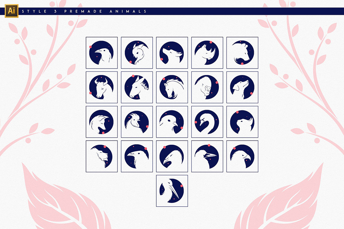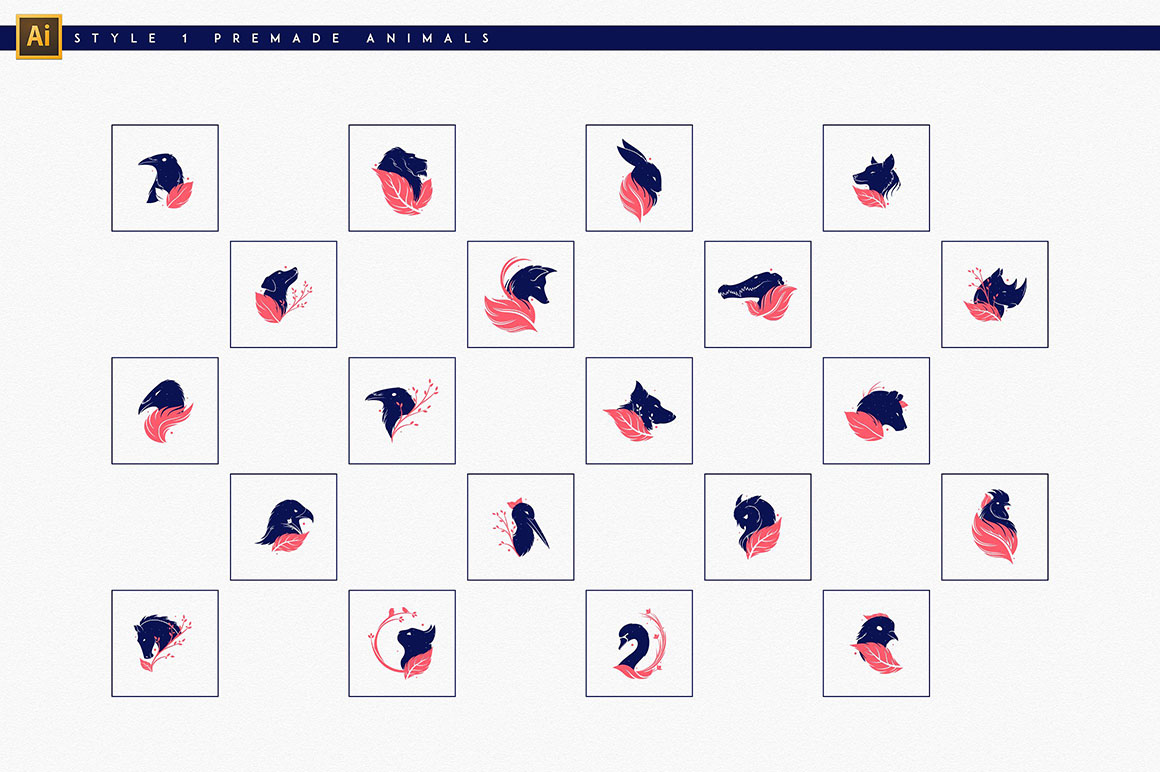 Animals – Creation Kit from VPcreativeshop contains 297 graphic elements with animals & nature for your new projects! Don’t miss this creative & artistic style branding & logo bundle 😉