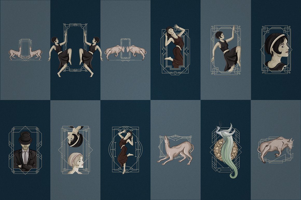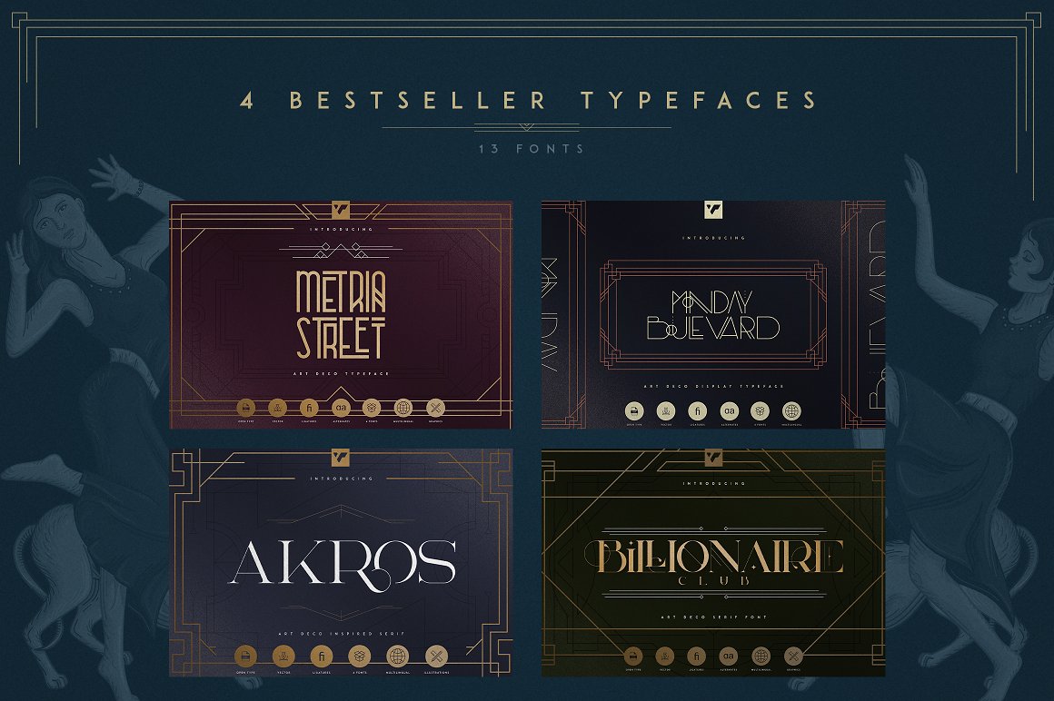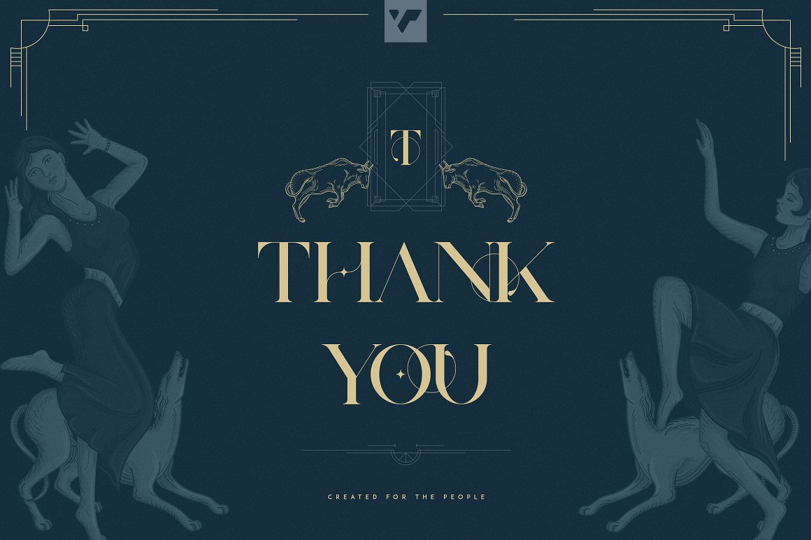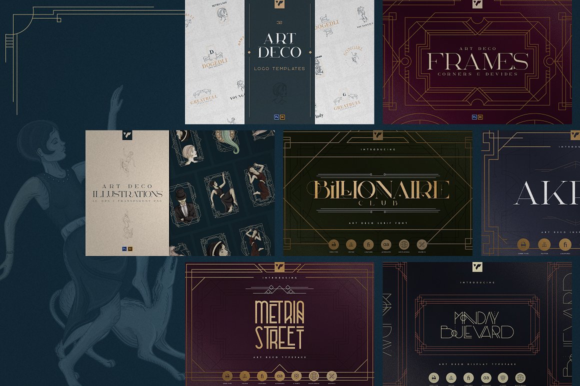 Art Deco Collection from VPcreativeshop contains 13 multilanguage display fonts in 4 font families and lot of vector graphics or logo templates! Don’t miss this creative & Art Deco style font & branding bundle 😉