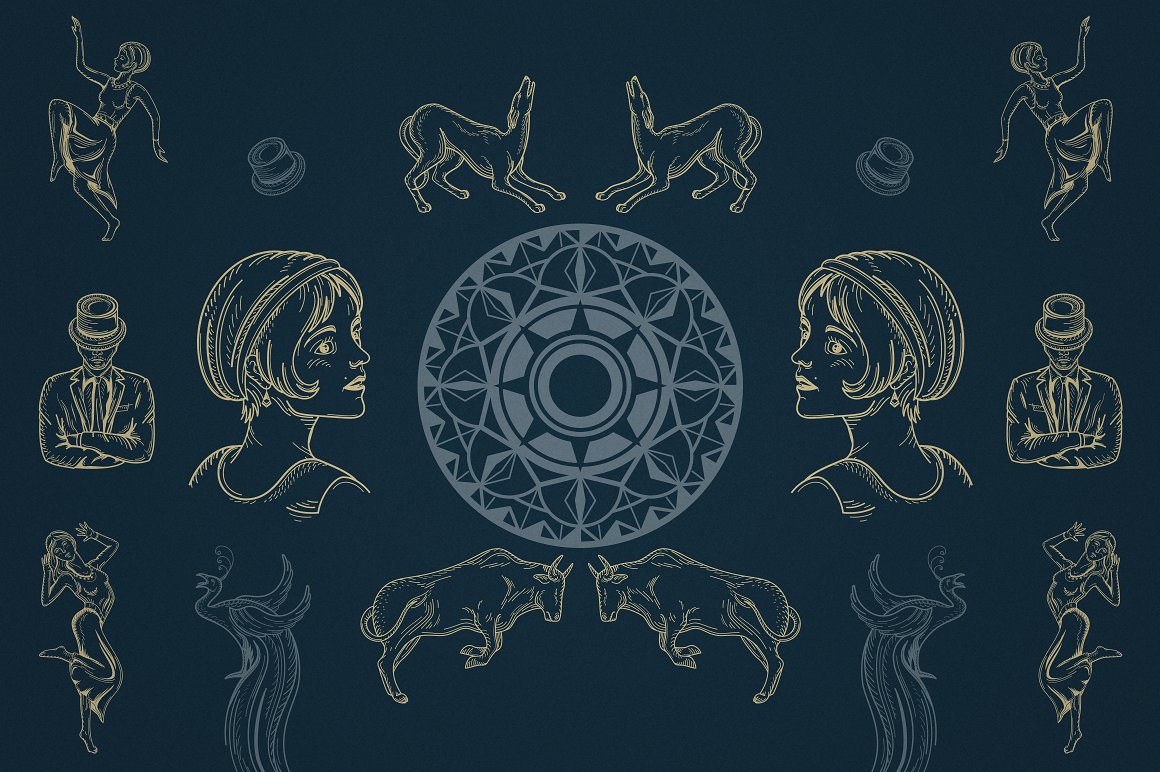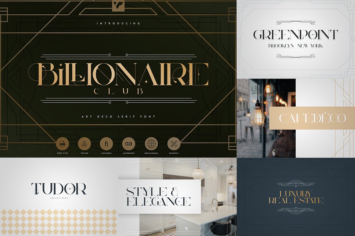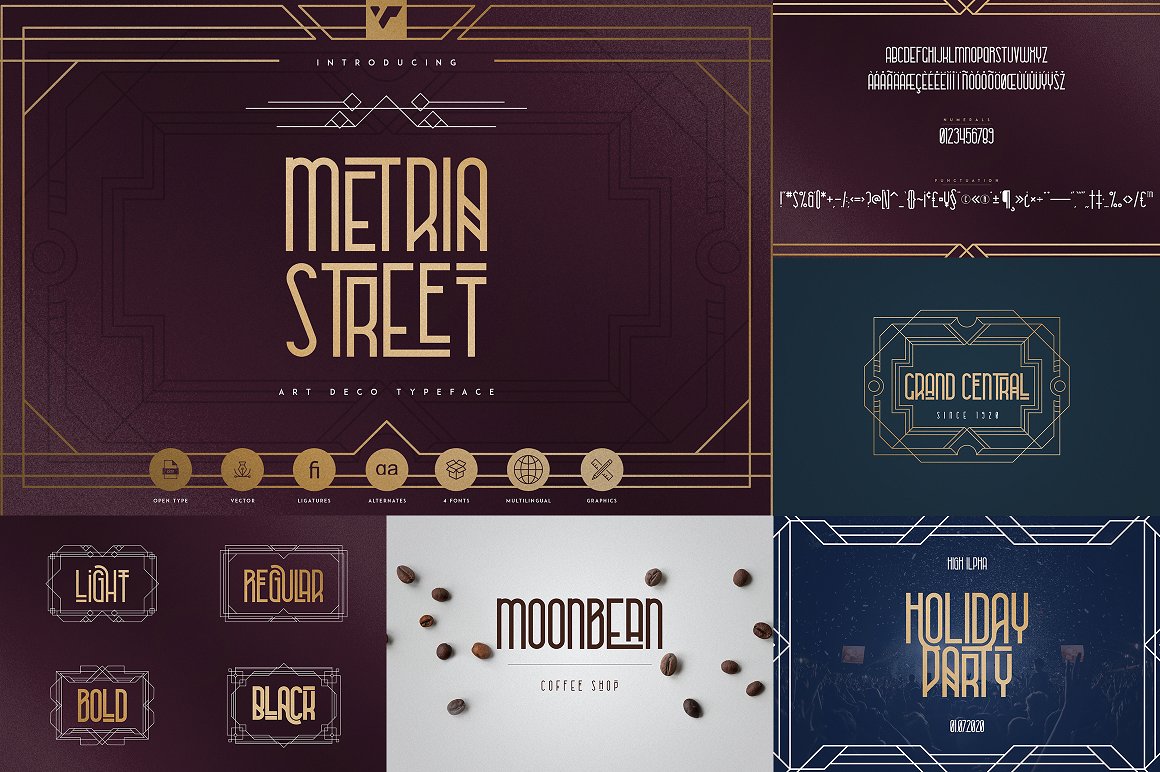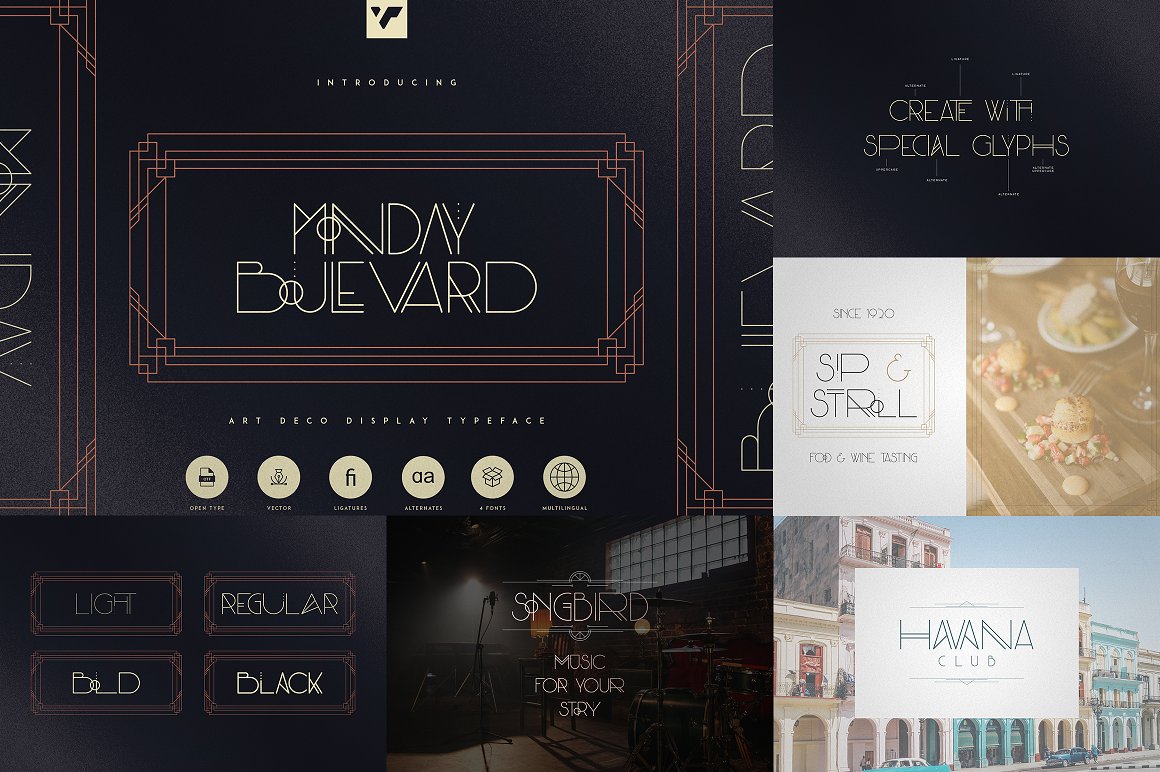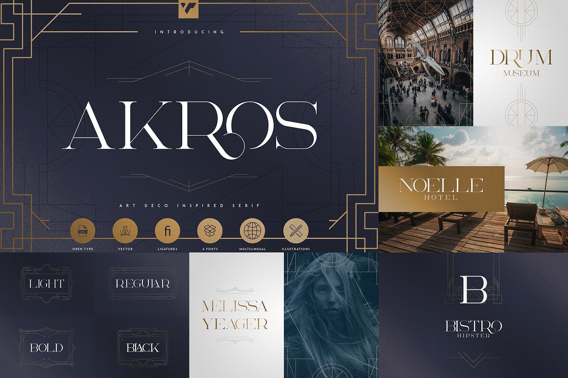 Art Deco Collection from VPcreativeshop contains 13 multilanguage display fonts in 4 font families and lot of vector graphics or logo templates! Don’t miss this creative & Art Deco style font & branding bundle 😉