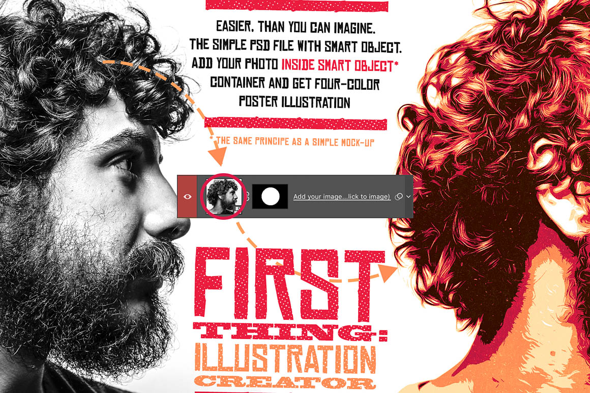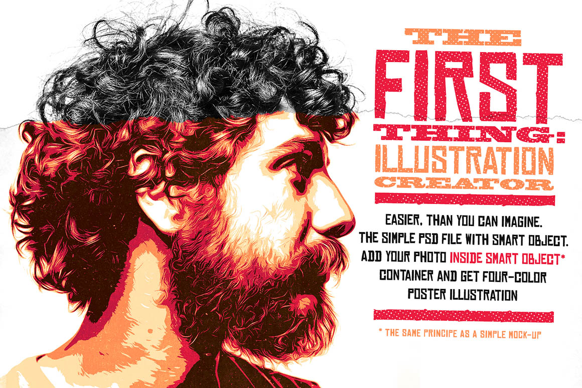 - The first thing is illustration Creator. The simple way to get awesome four color image with hand-drawned bright and shadows effect. Easy than you can imagine. Smart object mock-up based principe. Just add your image inside the smart object and get your poster illustration.