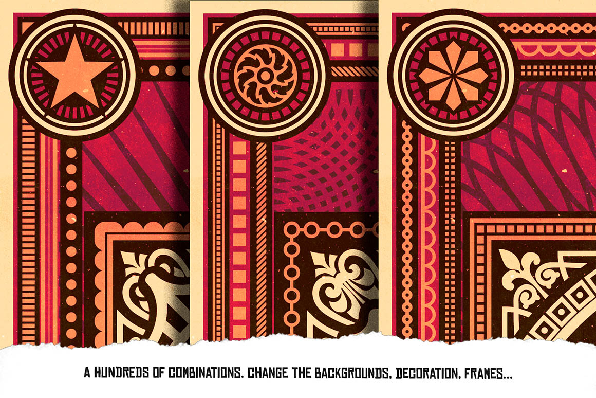 - And that where the magic is. A huge collection of well organized graphic elements let you incredible opportunities for your work. Decoration corner graphics, frames, artistic backgrounds, ribbons, and other decoration stuff! Stunning wide of combinations, you can create of hundreds graphic posters or any other graphic stuff, like cards, stickers, t-shirt prints.