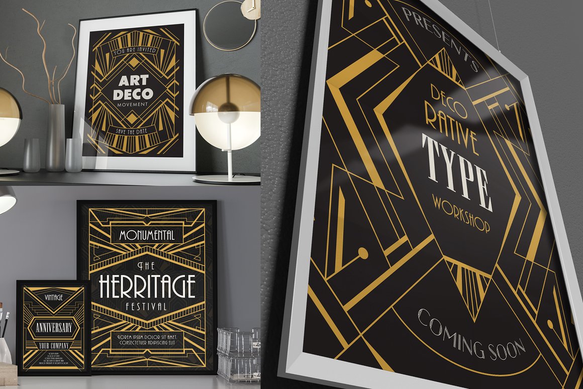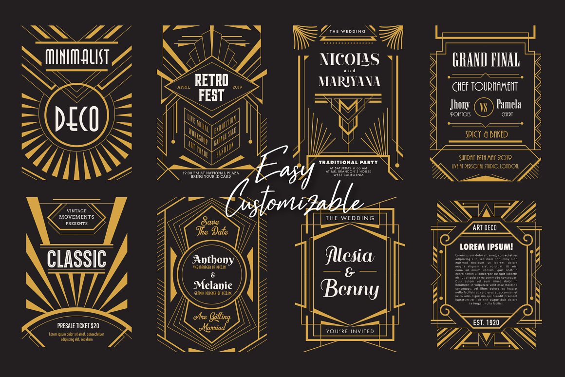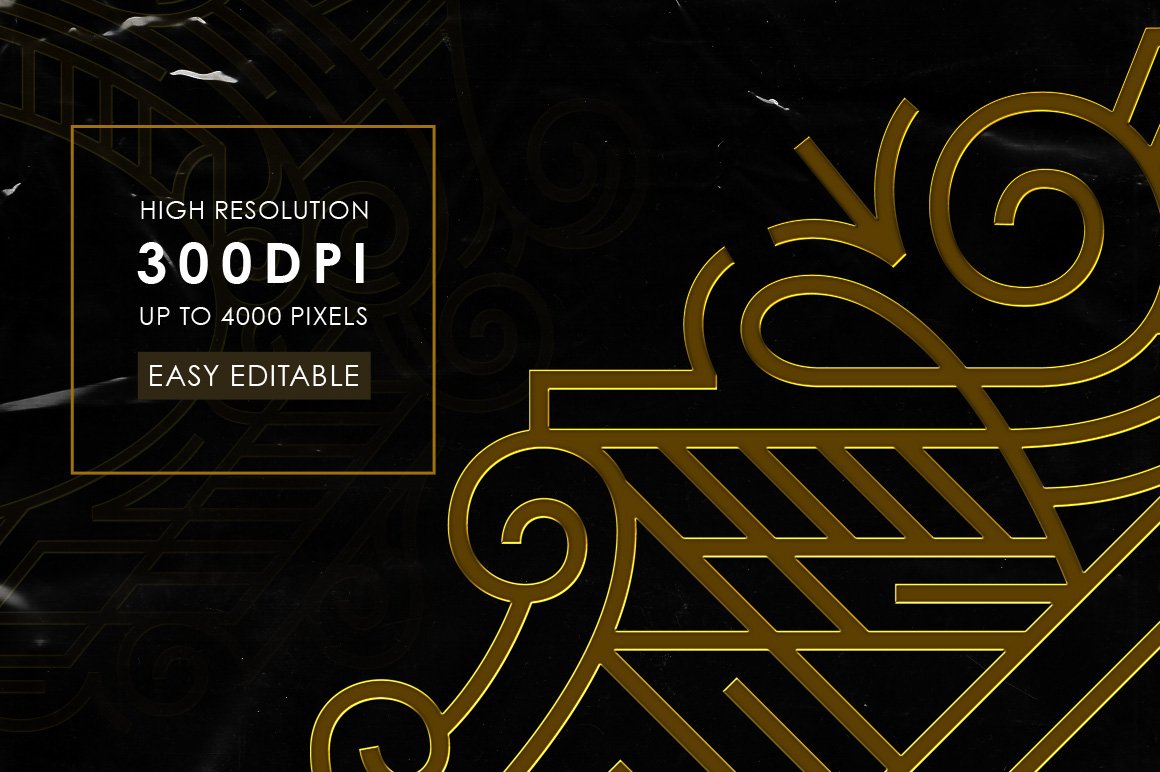 Introducing Art Deco Elegant Pattern & Frame . Art Deco element which designed to make your design more classy. This art deco element inspired by the decorative era in the 1920s and made with a combination of steampunk style. The pattern and frames come with a circular and geometric combination. Easy customizable with your own concept and easy to replace the texts. Very recommended for your poster, flyer, t-shirt, greeting cards, branding, craft, invitation or storefront. You can read the ‘ReadMe’ file to find the font links and follow some instructions.